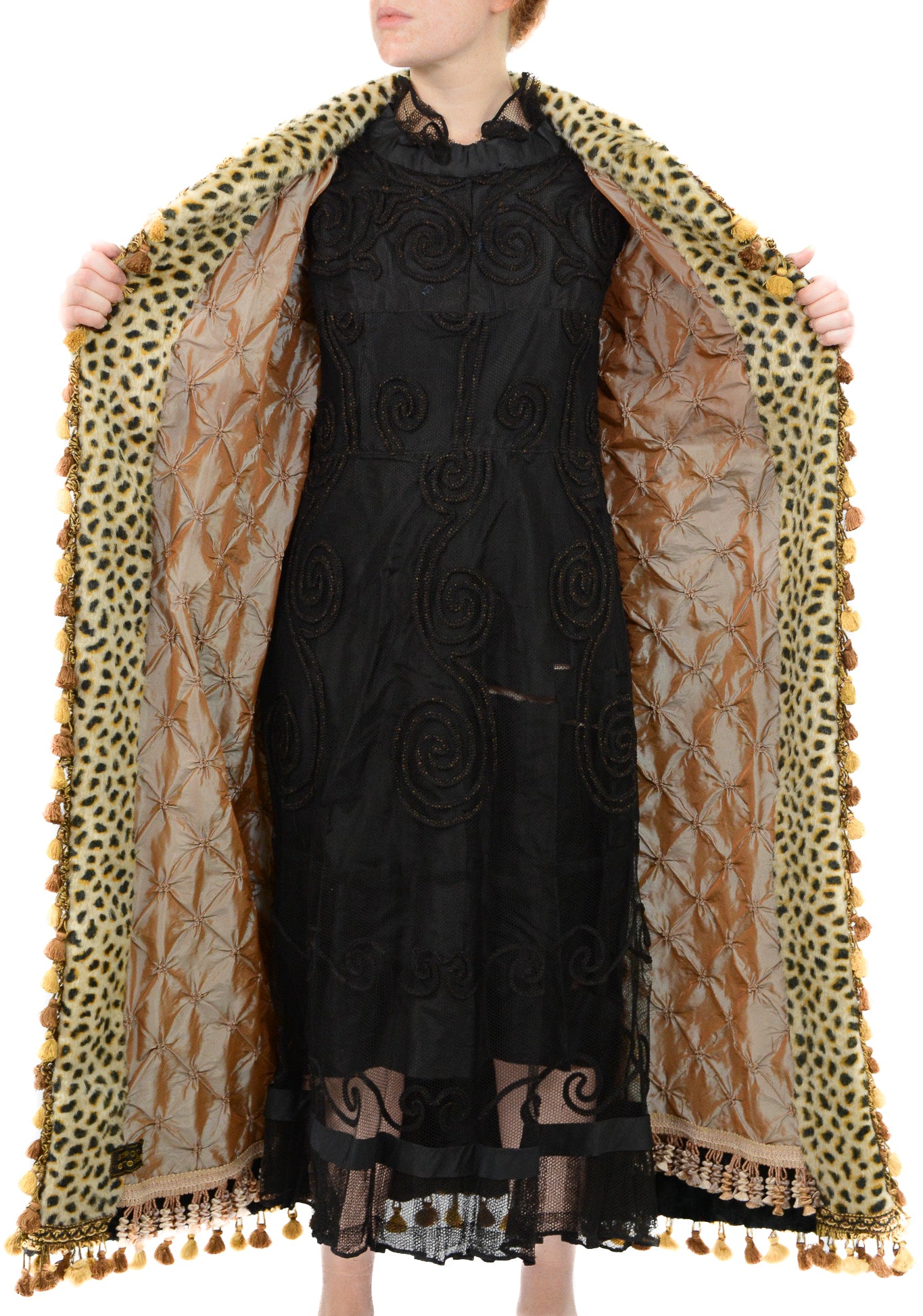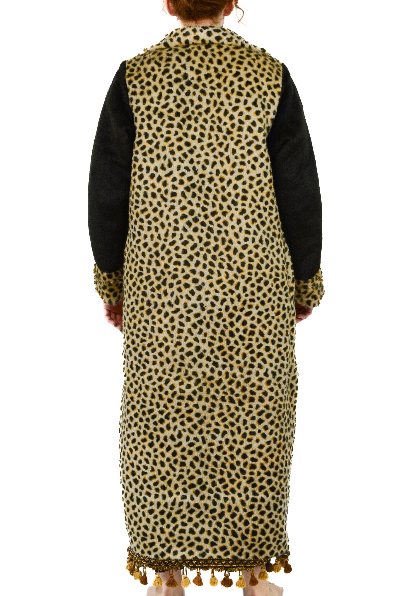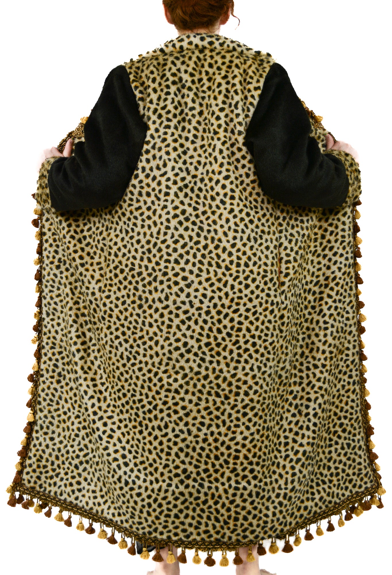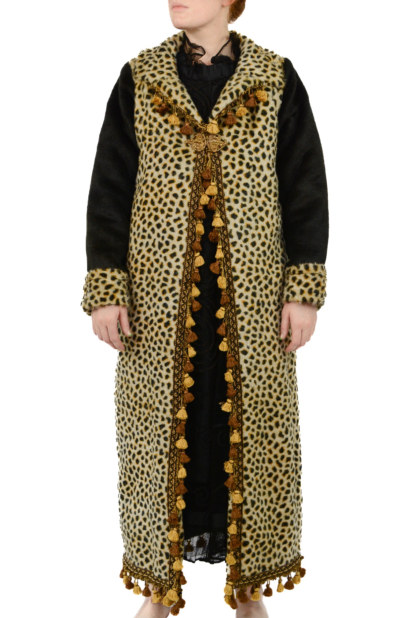 This exquisite bespoke coat, fashioned from an antique buggy, lap robe, or carriage blanket, is a unique creation by the Strook Company, a prominent U.S. manufacturer of such blankets from 1890 to 1920. Crafted with luxurious mohair and horsehair, the coat features a stunning cheetah print that flows seamlessly across both the front and back, with solid black wool sleeves accentuated by cheetah-print cuffs. The coat is beautifully trimmed with French scroll gimp and gold scalloped loop tassel trim, complemented by black woven braided cotton and silk threading that enhance the cheetah motif’s rich shades of gold, bronze, and black. Inside, the coat reveals a taffeta pinwheel-style ruched lining, with a tiered tassel trim attached to a channel ribbon in silvers, coppers, and ecru. The clasp is an ornate baroque-style gold-toned relief brass metal closure, hand-sewn with intricate scroll and floral patterns. This design is inspired by Kisaru, a celebrated cheetah from the northern Masai Mara in Africa, known for her exceptional mothering and successful rearing of her cubs. Embracing Kisaru’s protective and fierce nature, this coat is a powerful statement of strength and elegance.