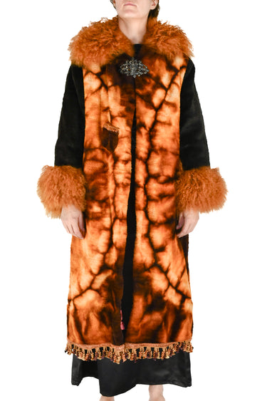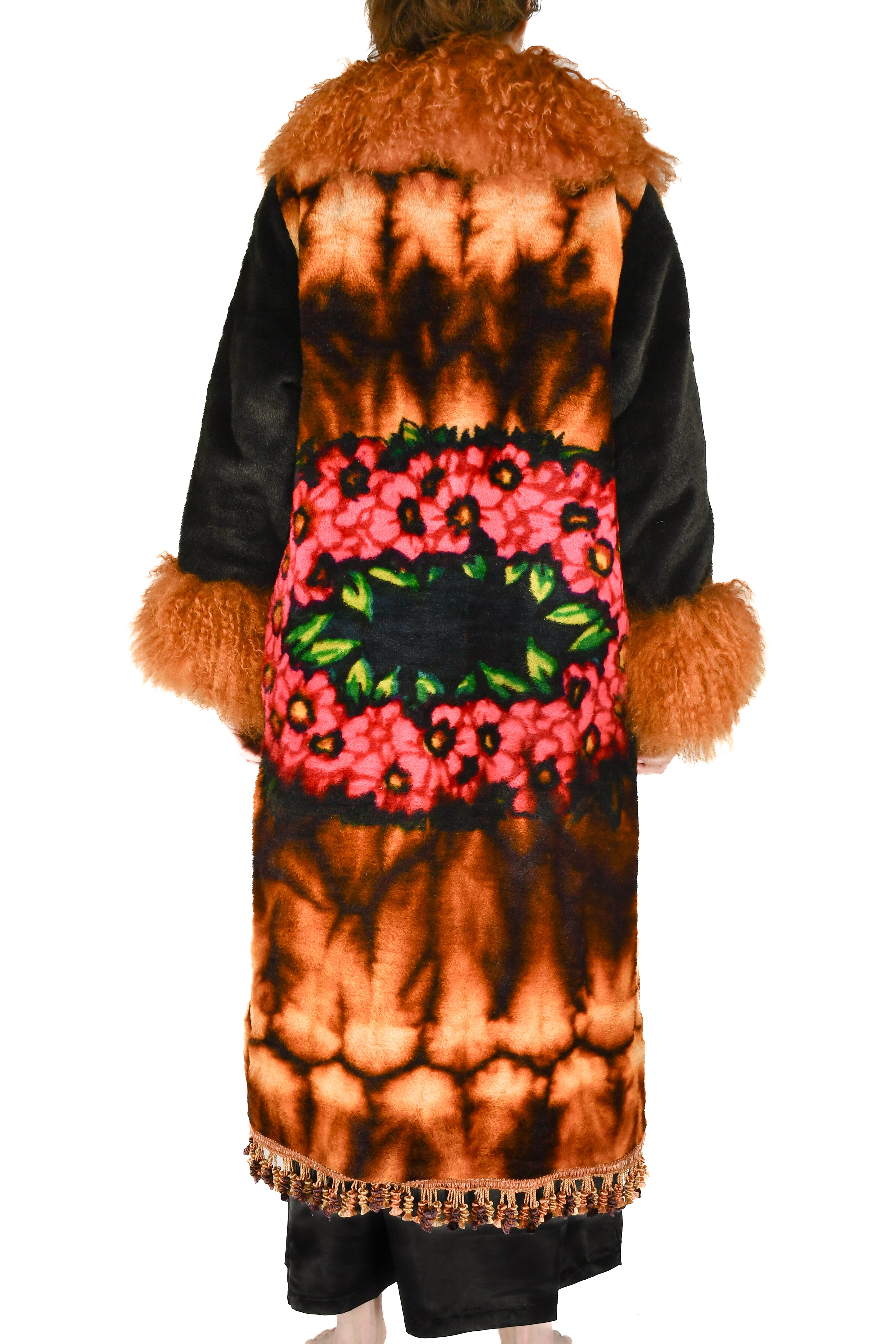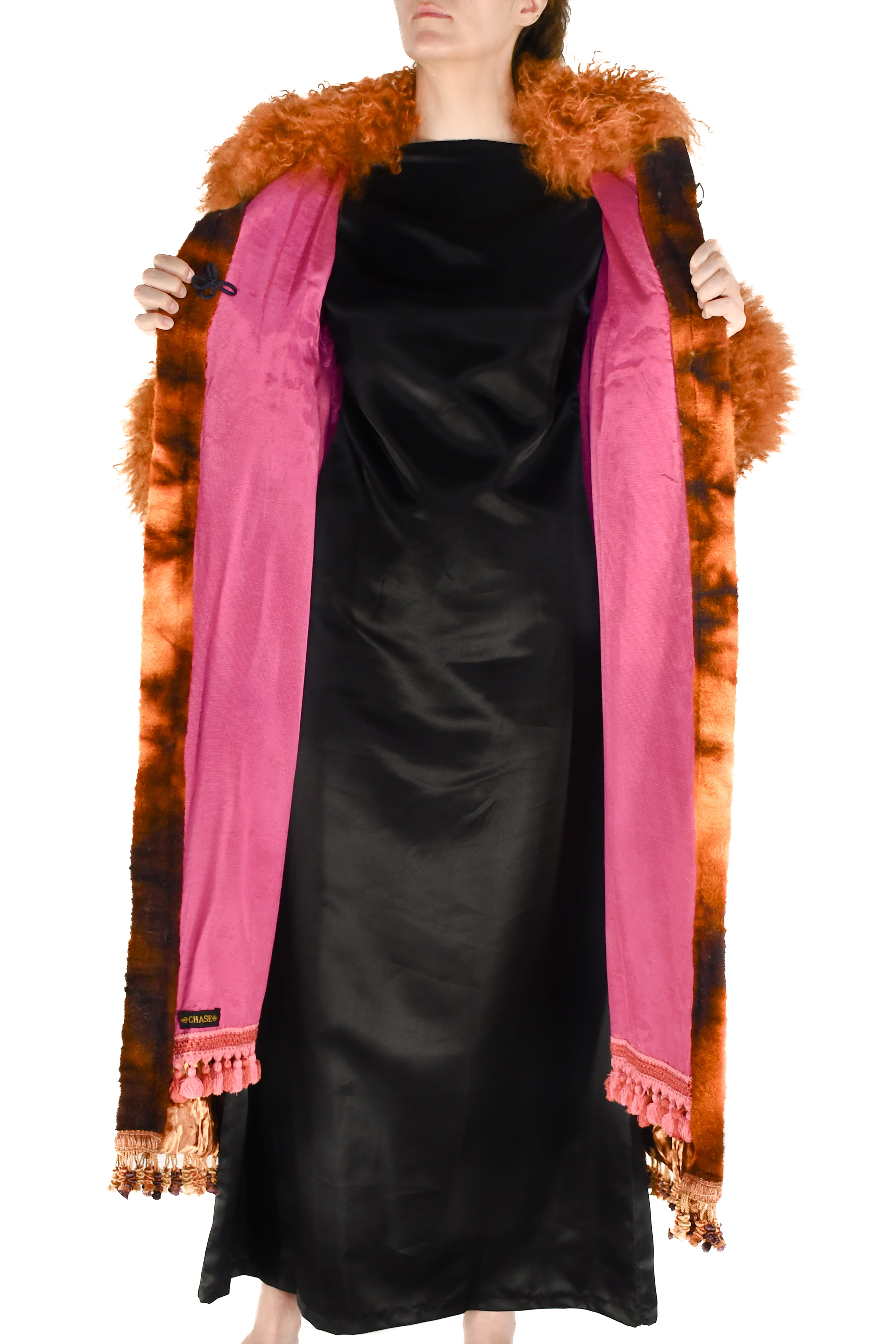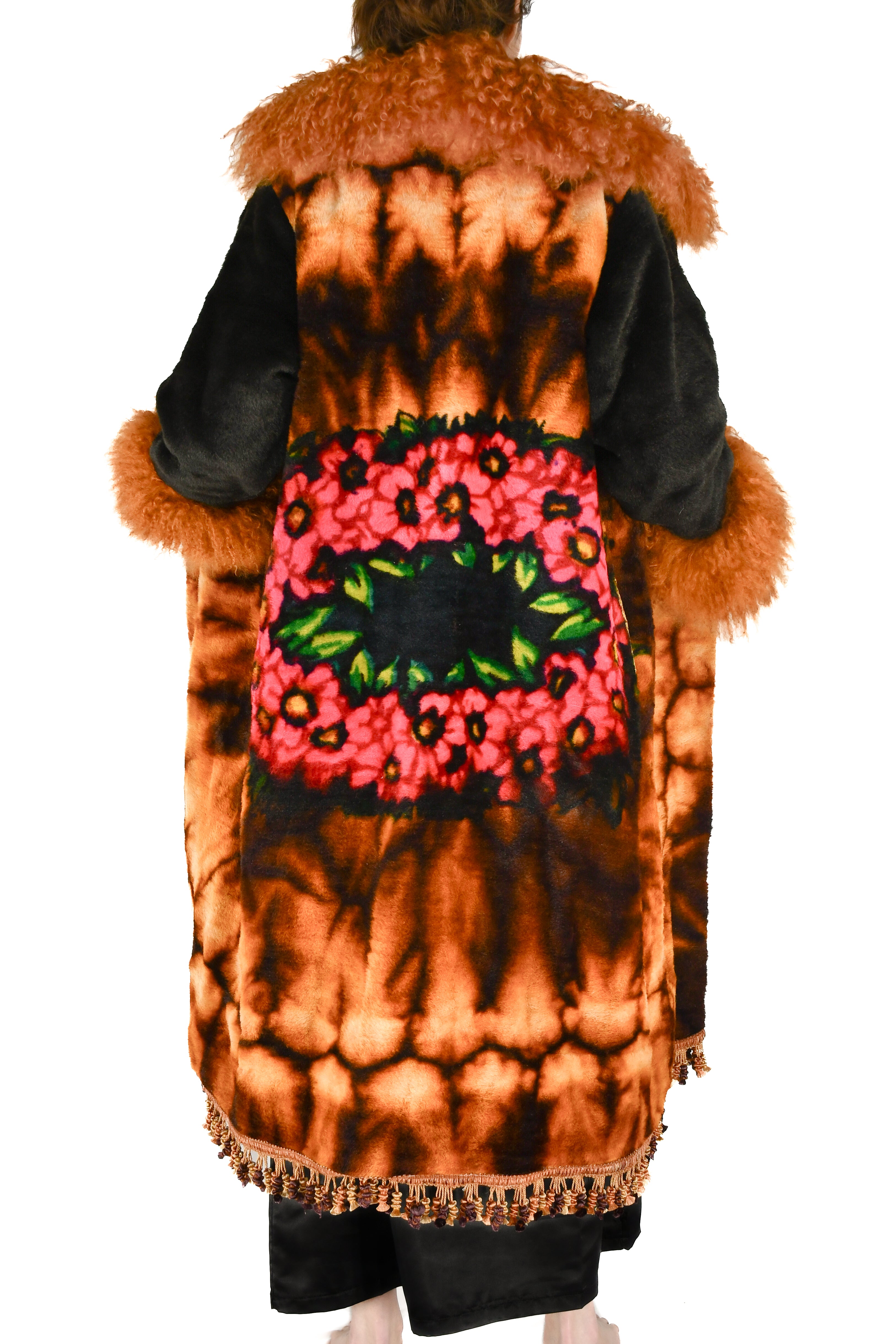 The sleeves, crafted from the original black portions of the blanket, offer a sleek contrast to the ornate back panel. The collar and cuffs are luxuriously trimmed in a warm ginger-colored Mongolian lambswool, adding both texture and a golden glow to the overall silhouette. The hemline is finished with a woven fringe of tasseled trim in copper, gold, and deep eggplant tones, giving the piece an elegant, grounded weight.