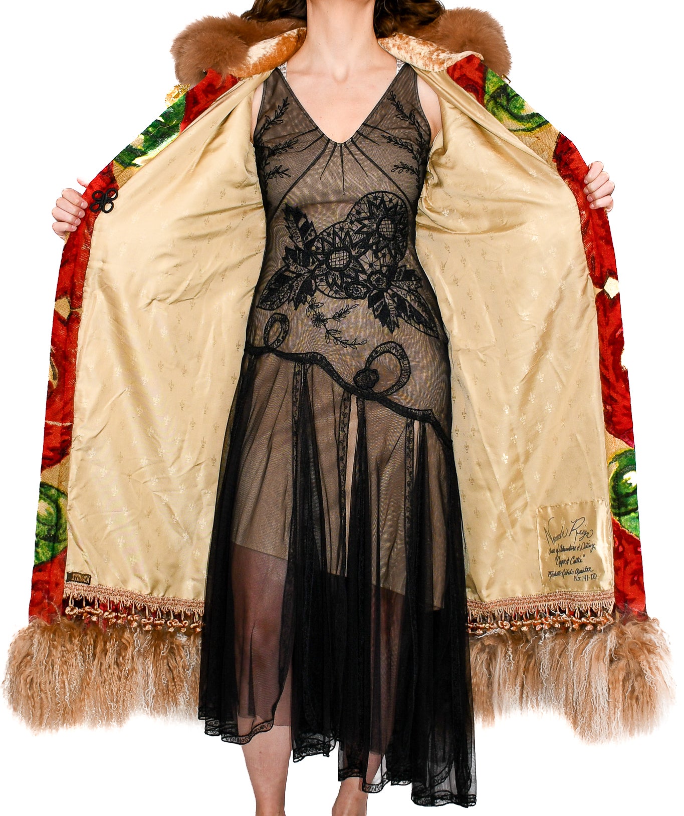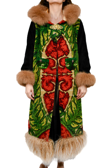 Surrounding them is an ornate, wide border in crimson garnet and forest green, detailed with intricate floral and leaf patterns that flow around the edges and wrap seamlessly to the front of the coat. Two decorative pockets on the front are crafted from preserved sections of the original vintage blanket, honoring the textile’s history while adding visual interest. Functional silk-lined side pockets offer effortless practicality.