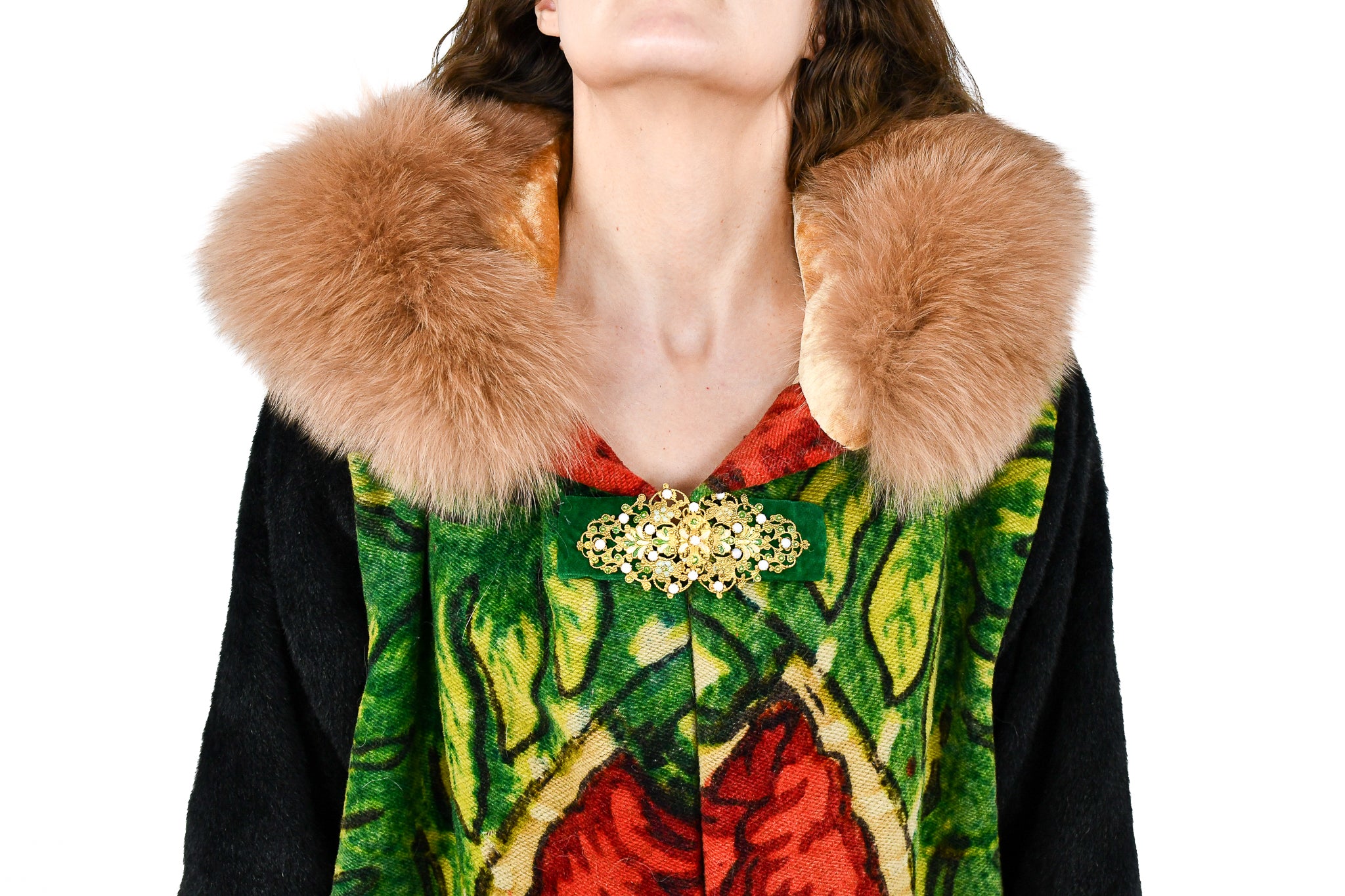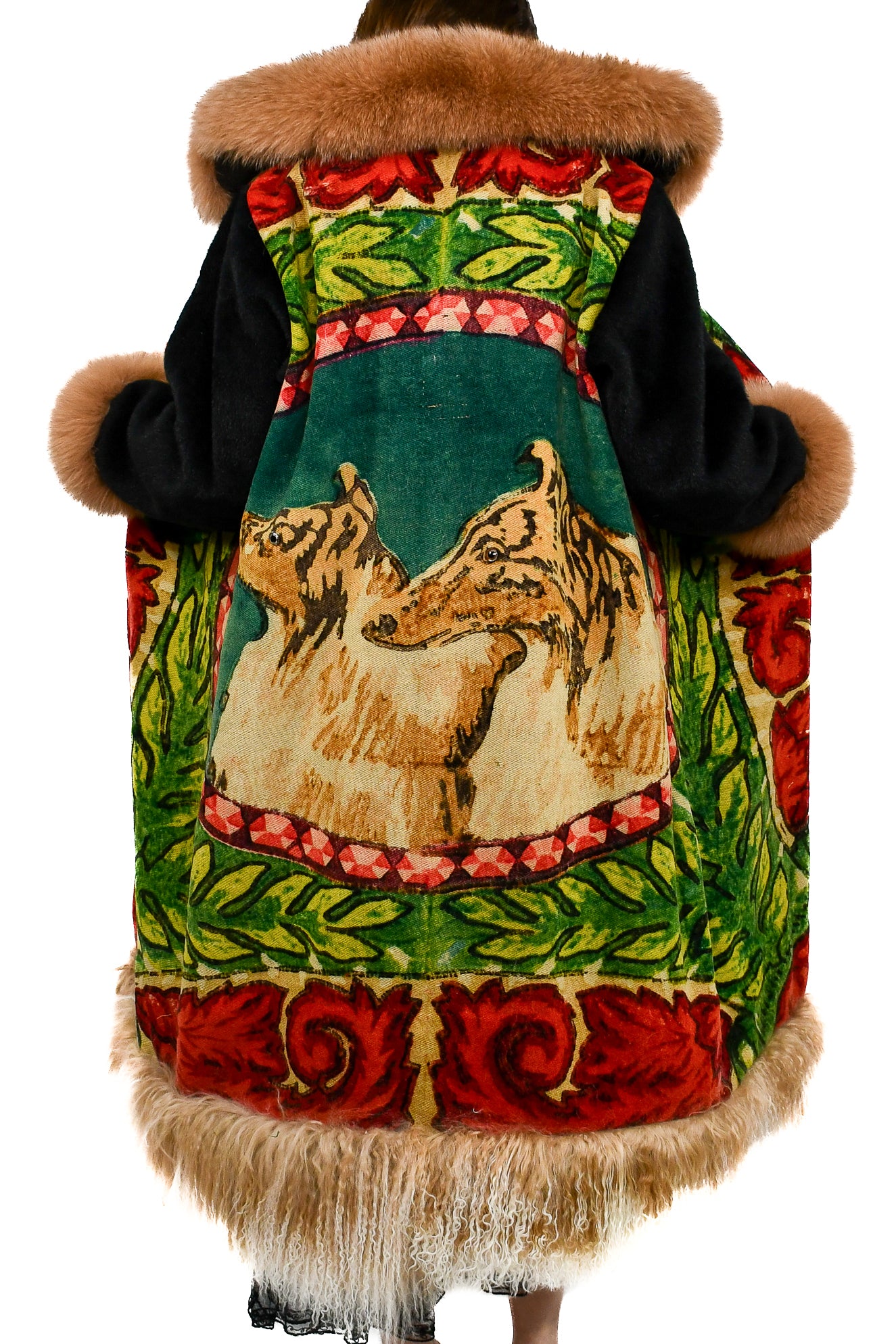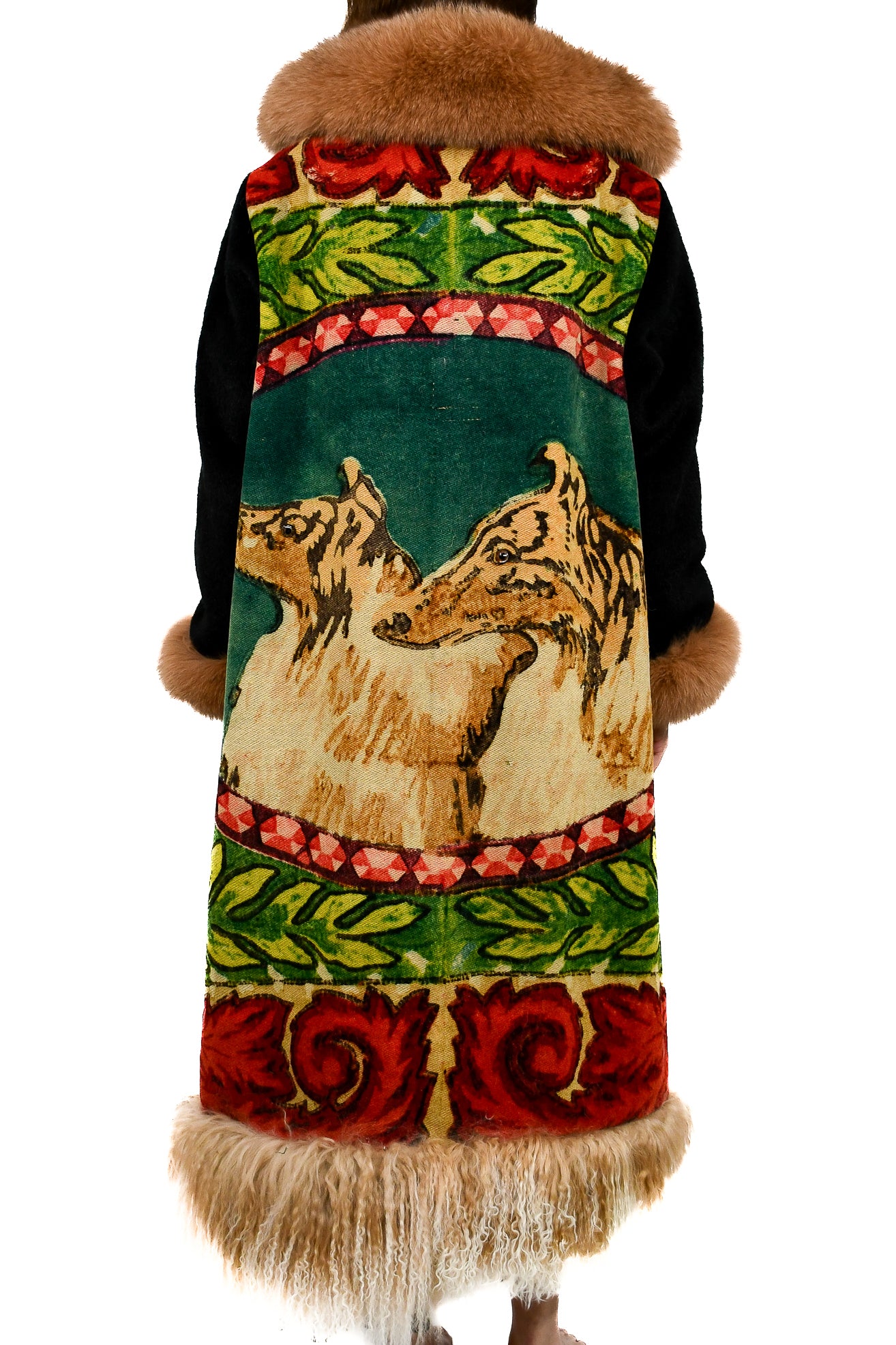 The collar and cuffs are trimmed in a lush copper-toned fox fur, while the hemline features soft lambswool in a blend of burnished copper and porcelain cream, creating harmony with the hues of the featured dogs. At the front, the coat fastens with an ornate vintage-inspired filigree clasp—Baroque or Rococo in spirit—adorned with jade-green and alabaster-white stone accents.
