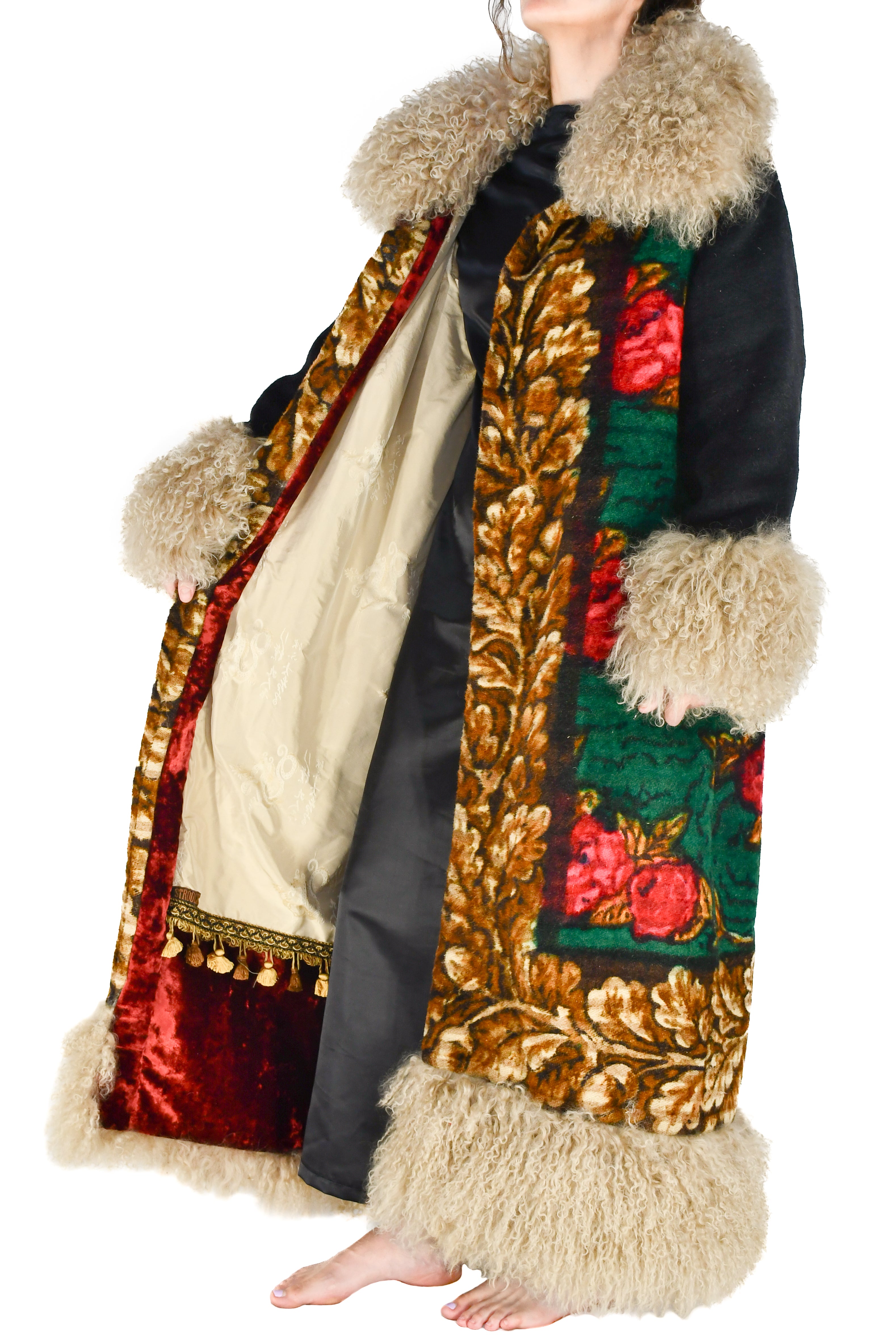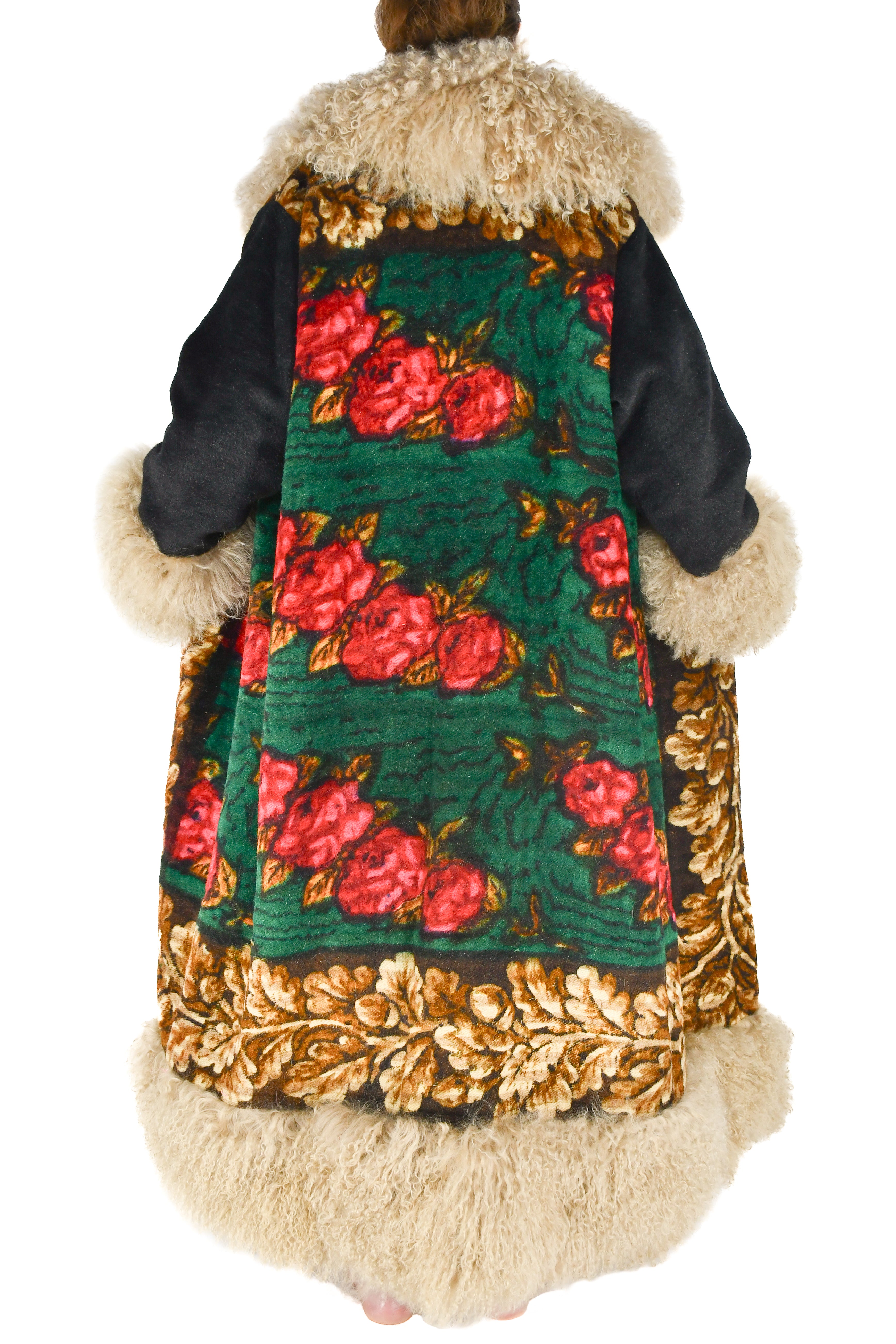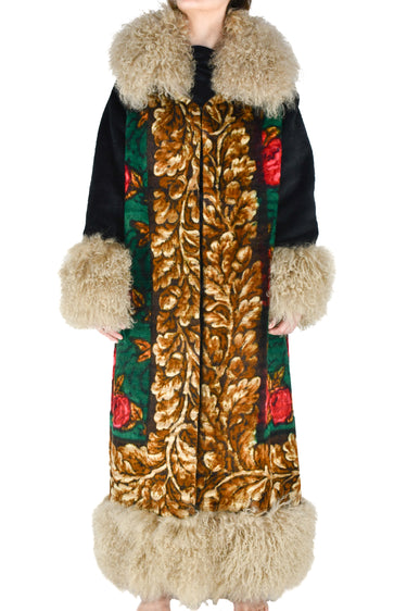 The front panels carry a seamless continuation of the floral scene, creating a harmonious visual story. The collar, cuffs, and full-length hem are trimmed in sumptuous taupe Mongolian lambswool, adding both texture and warmth to the silhouette.