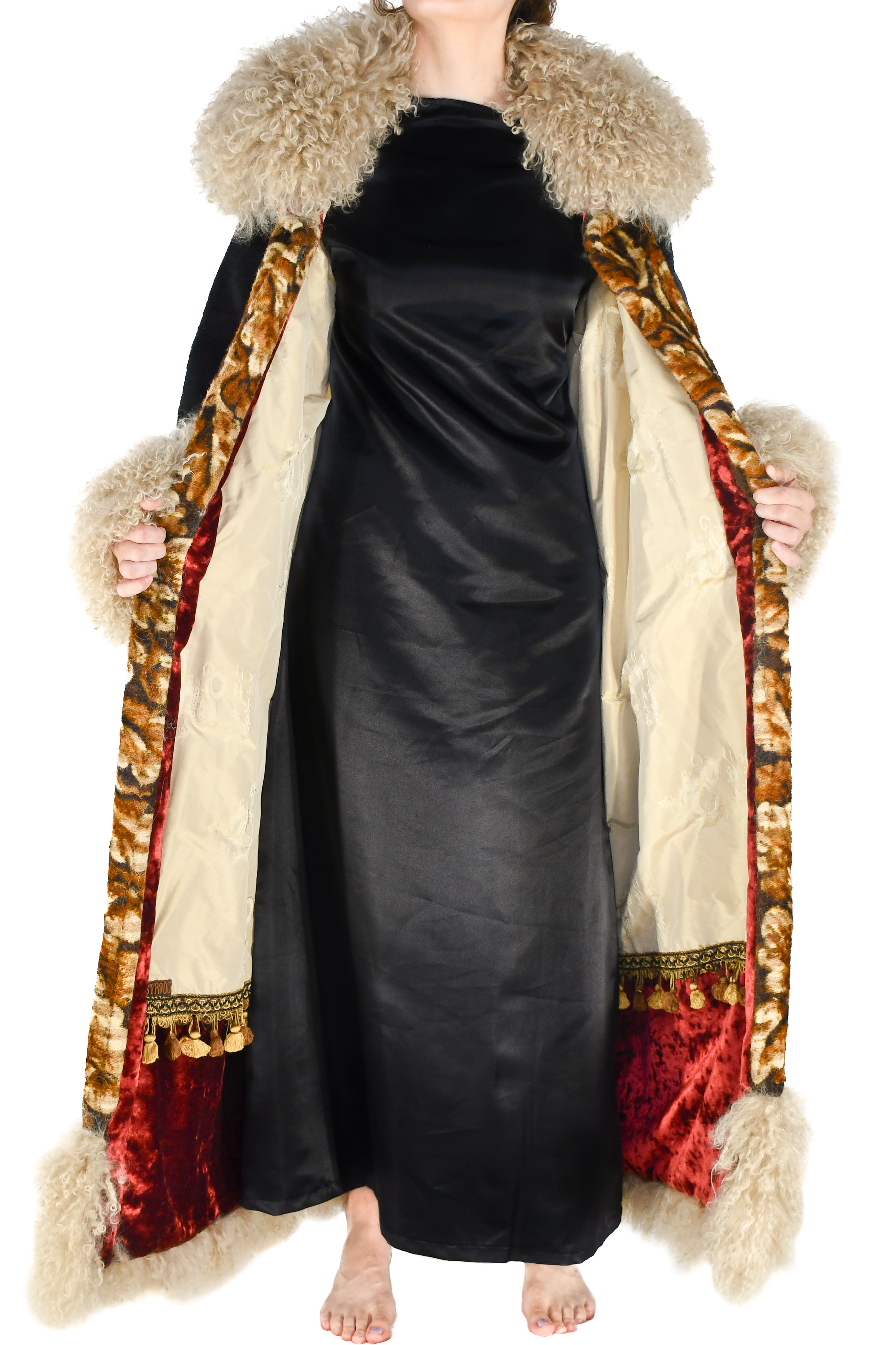 Two silk-lined side pockets are subtly integrated for both function and refinement. Inside, the coat is fully lined with an opulent silk featuring an intricate Chinese dragon motif. A lush red velvet lines the base of the interior, finished with a vintage French woven tassel trim in a palette of warm browns.