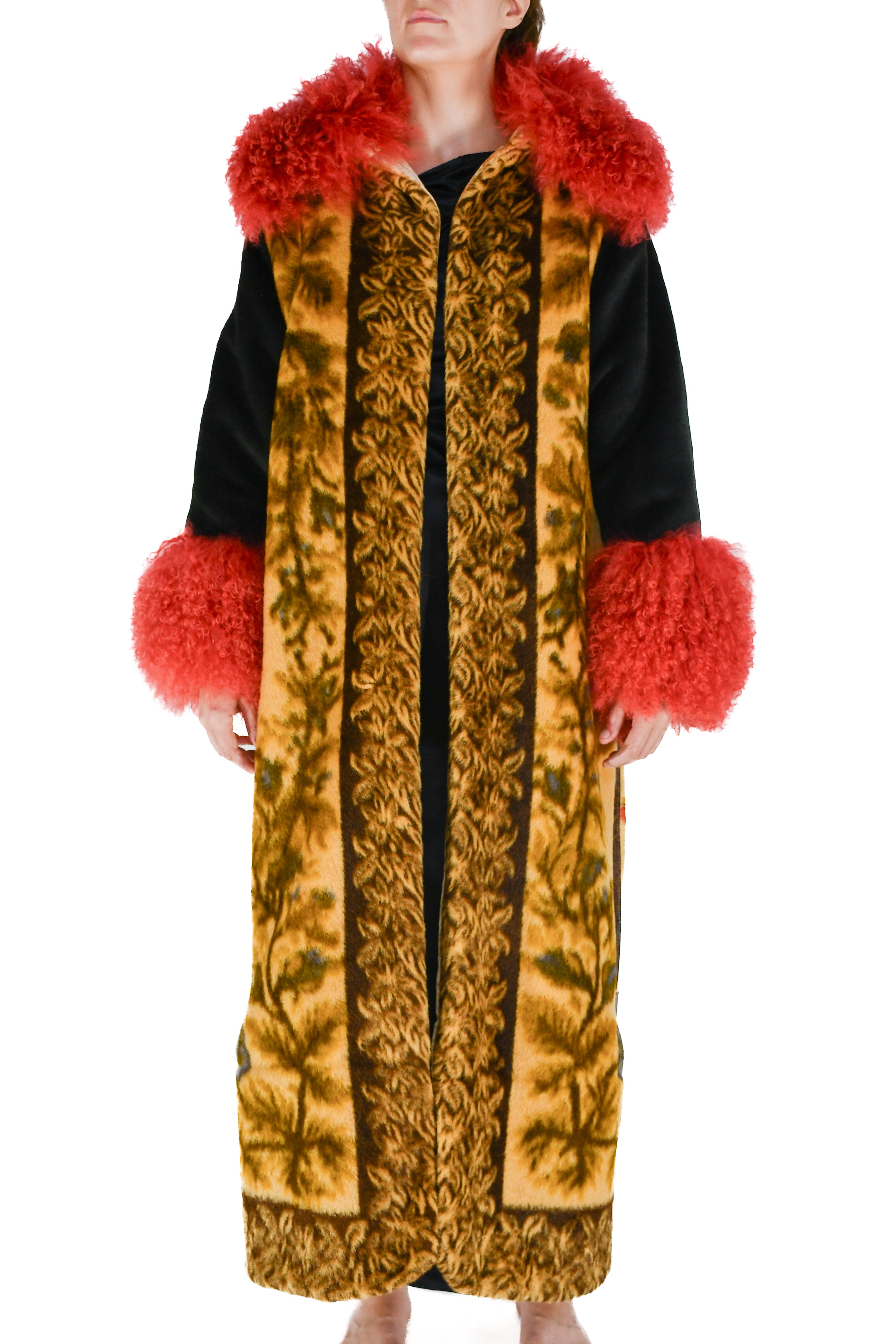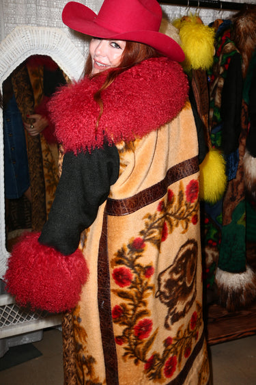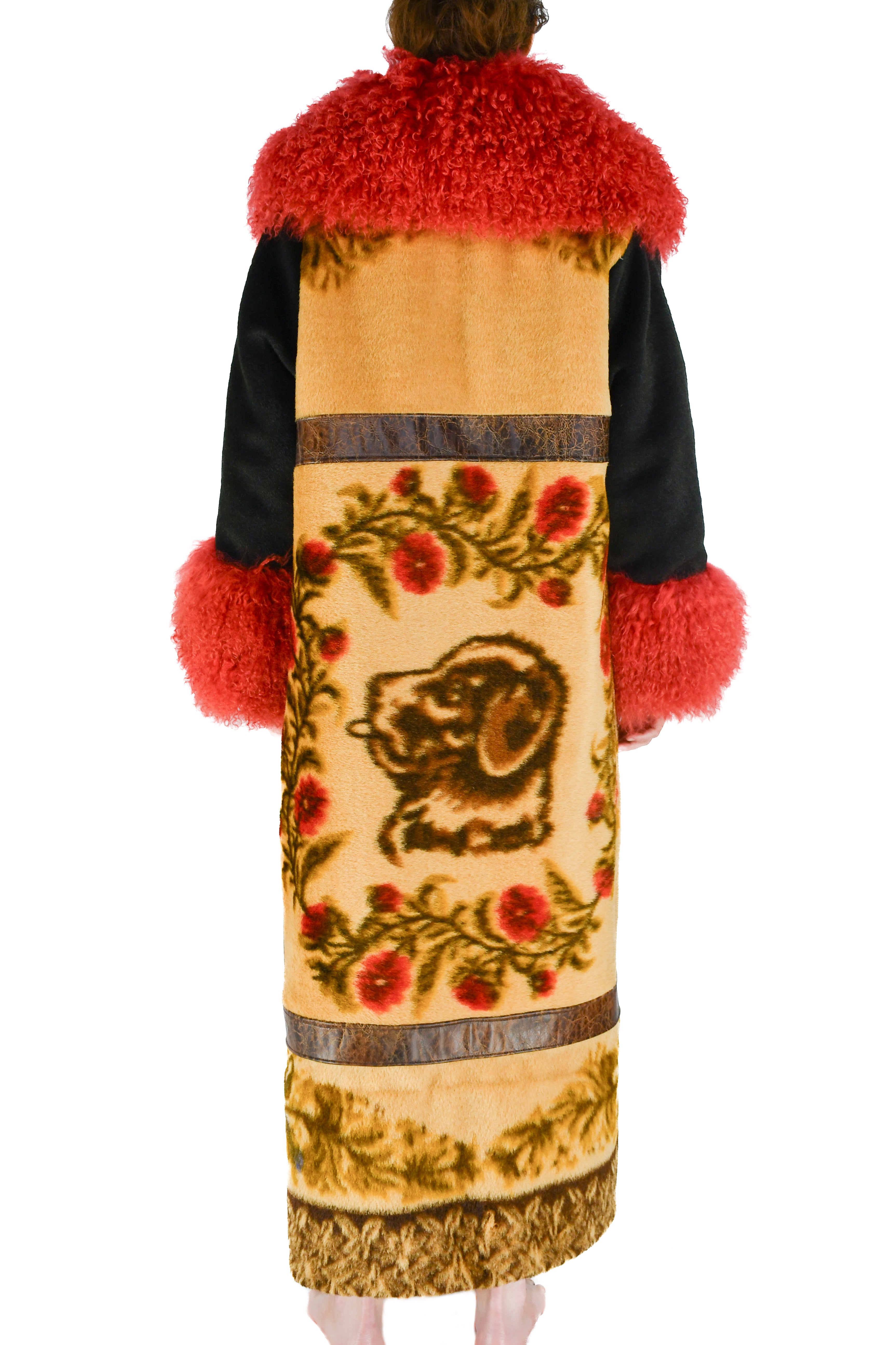 Solid black sleeves, fashioned from the original blanket, lend structure and contrast. The collar and cuffs are trimmed in luxurious crimson Mongolian lambswool, adding warmth and an opulent pop of color. Two silk-lined pockets blend function with elegance, while the front panels mirror the intricate back design, allowing the visual narrative to unfold across the entire garment. The front edge of the coat features a tan and brown fall foliage pattern, echoing the theme of seasons and remembrance, and is fastened with a subtle hook-and-eye closure.