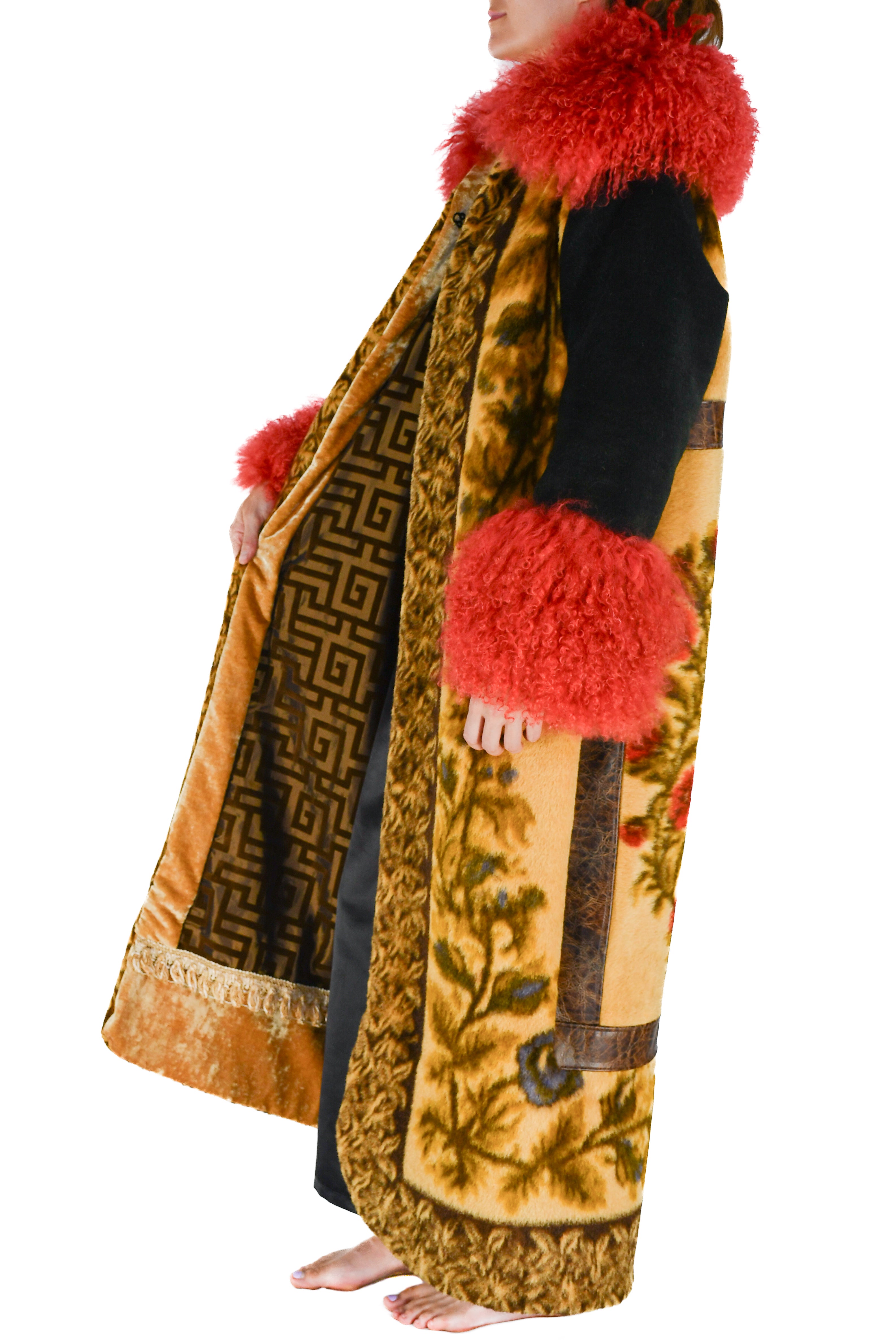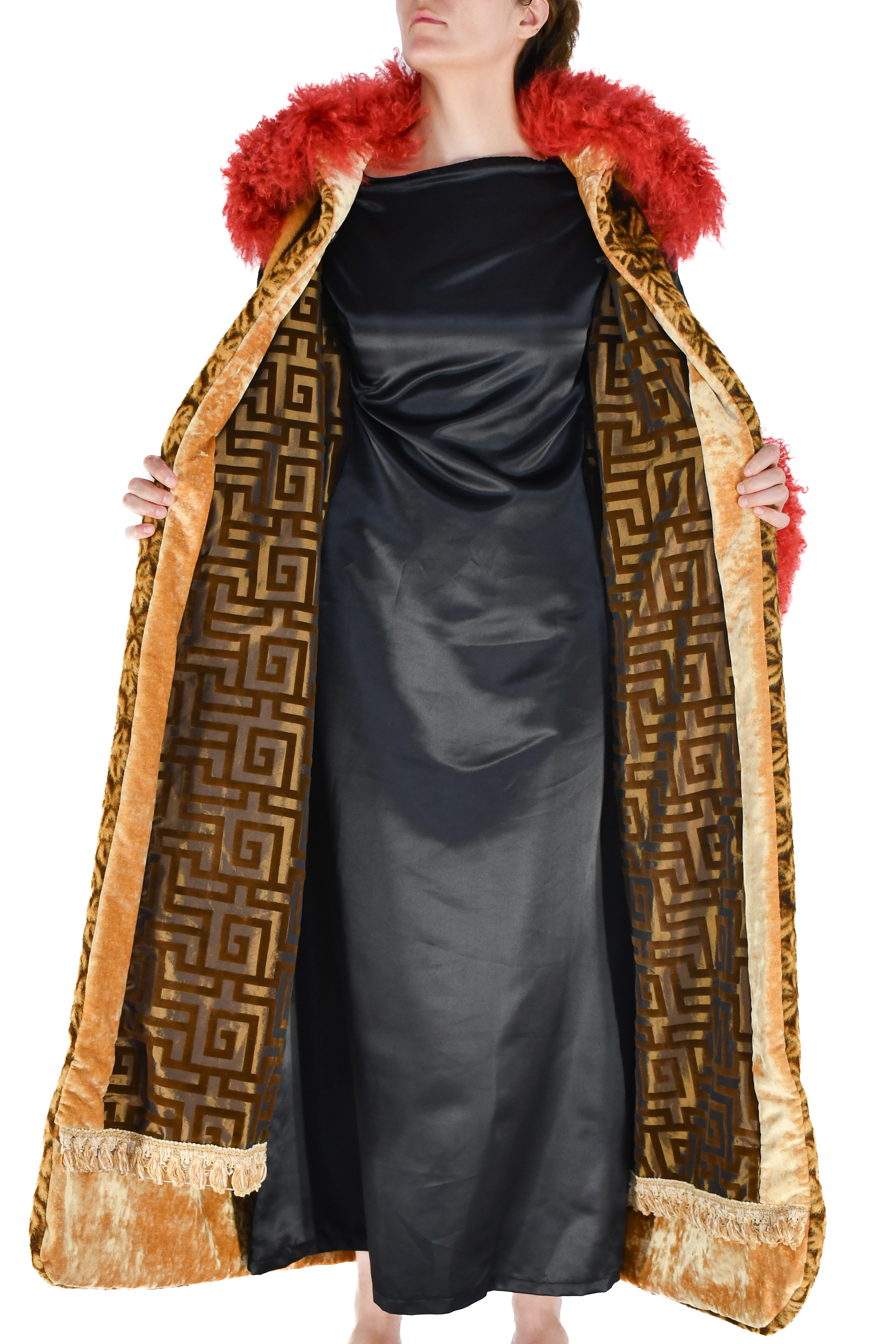 Inside, the coat is lined in a silk and velvet burnout fabric woven with a Grecian key design in tones of golden bronze and brown. A woven tassel trim in cream and gold adds detail along the hem, and the bottom liner is finished in a plush golden velvet.