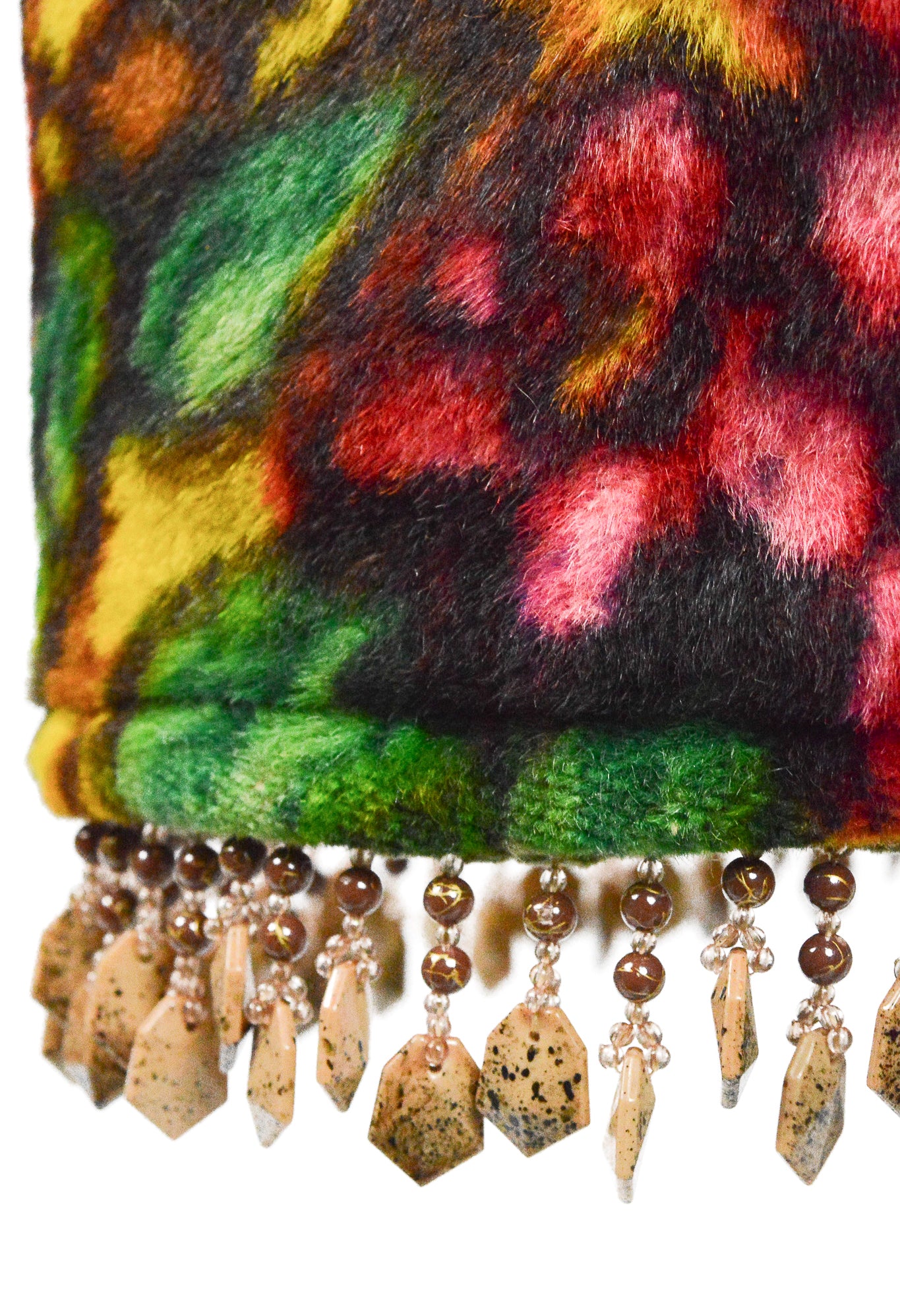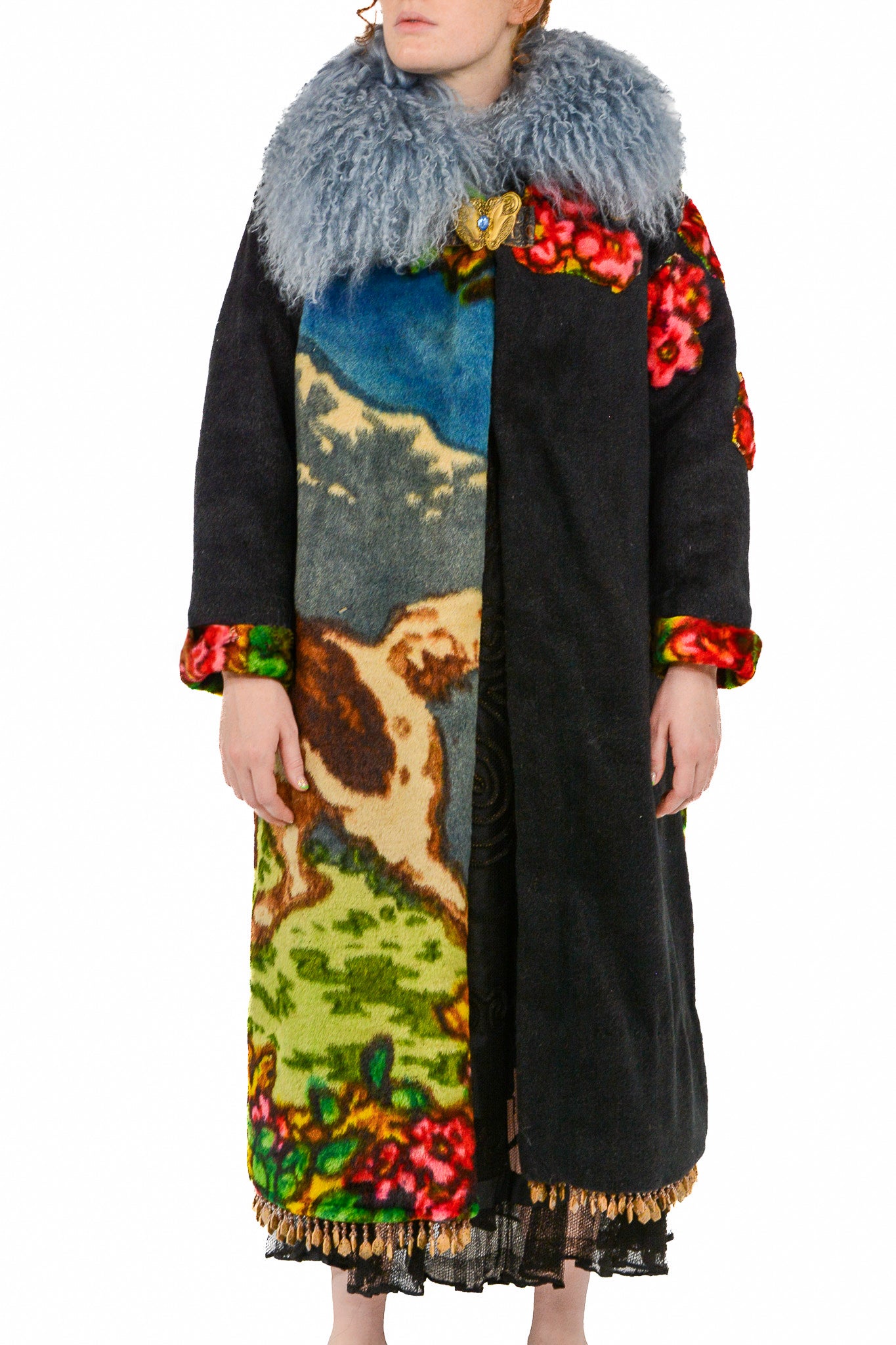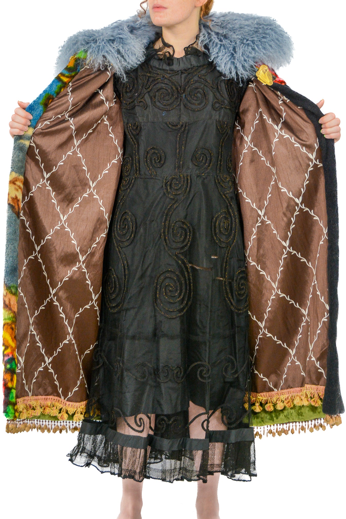 The upper yoke continues this floral theme with delicate desert rose patterns, while the sleeves, crafted from the blanket's original black wool, maintain a sense of continuity and elegance. Faux stone tassel trims accentuate the cuffs, mirroring the coat’s intricate floral details. For practicality and added warmth, discreet silk-lined pockets are placed on either side. The collar, made from sumptuous sky-blue Tibetan lamb’s wool, creates a striking contrast with the rich chocolate raw silk of the Bonfield motif, while the interior is lined with vibrant Kelly-green velvet, enhanced by a vintage-inspired pastel mirror wool trim, complete with tassels in pink, green, and cream.