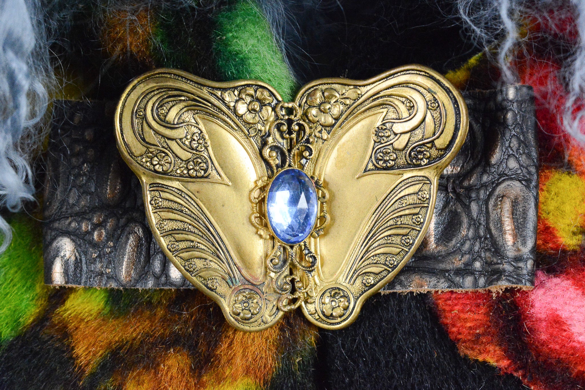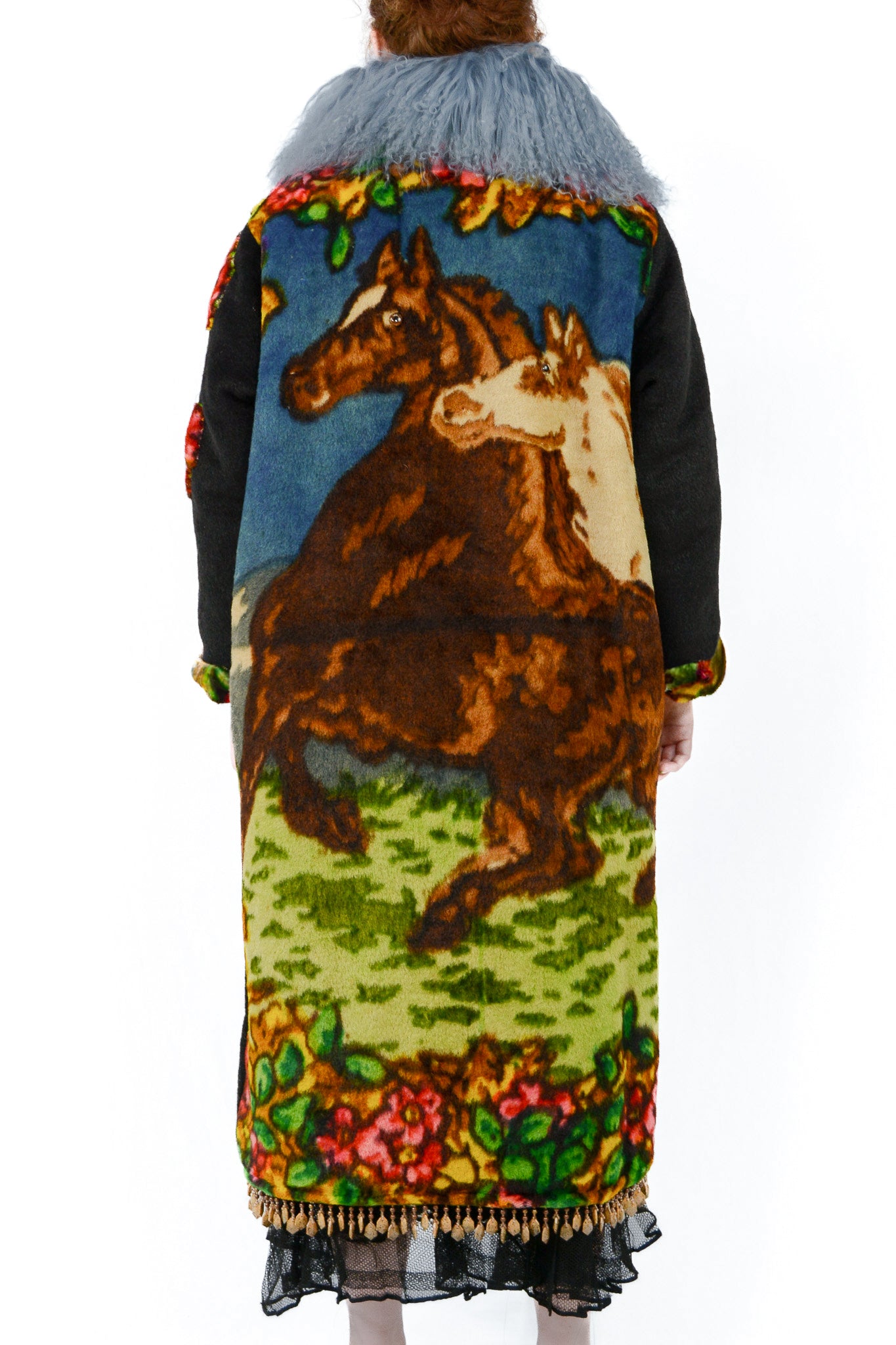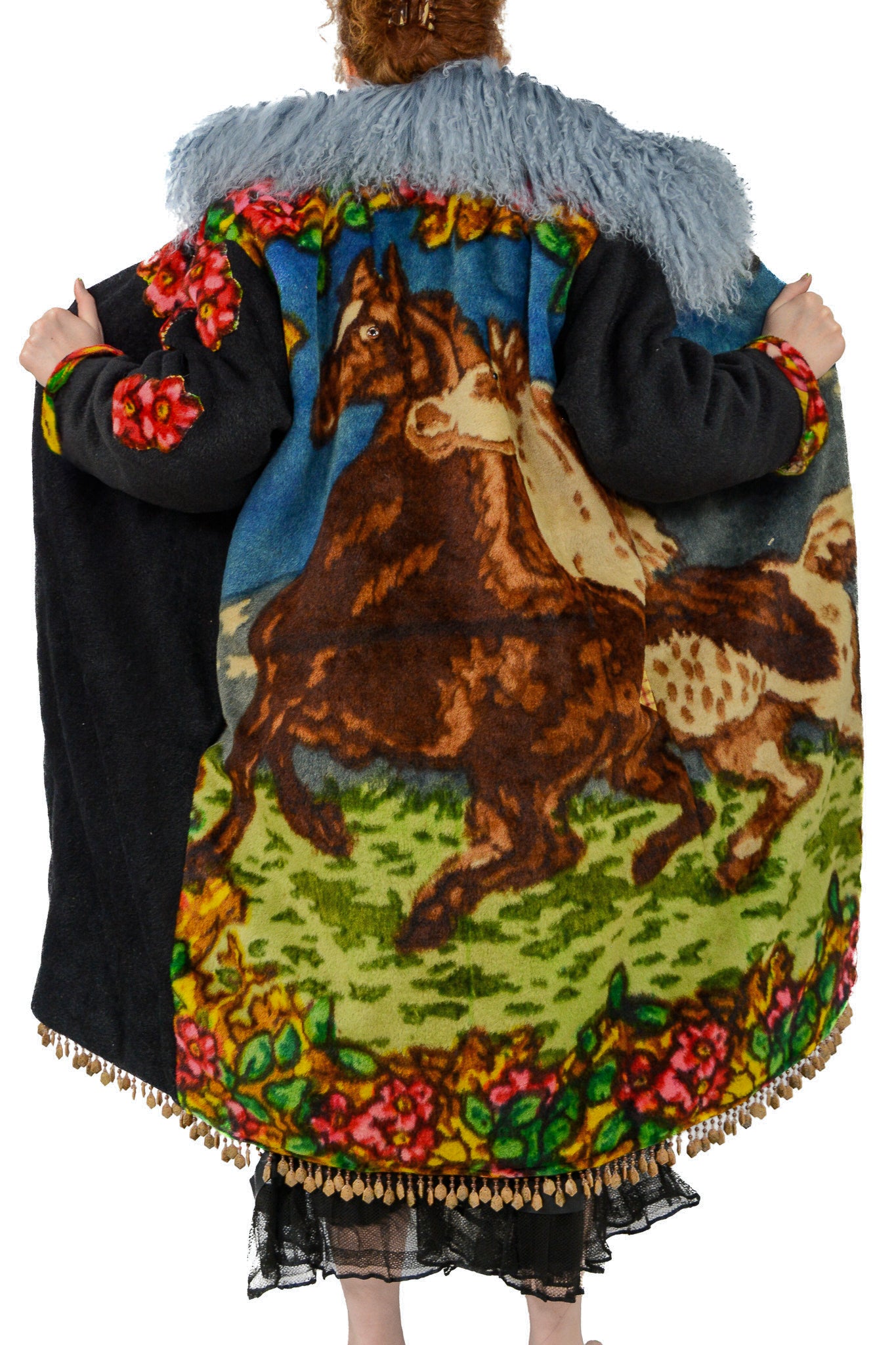 The lower hem is adorned with faux stone and bead detailing, echoing the refined accents on the cuffs and ensuring a harmonious finish. An antique Art Nouveau clasp, set with a radiant blue gemstone and secured with leather strips, adds an air of regal refinement. The coat’s solid black front contrasts beautifully with the vibrant horse and floral motifs that grace the back and sleeves, creating a wearable masterpiece of historical grandeur and couture artistry.