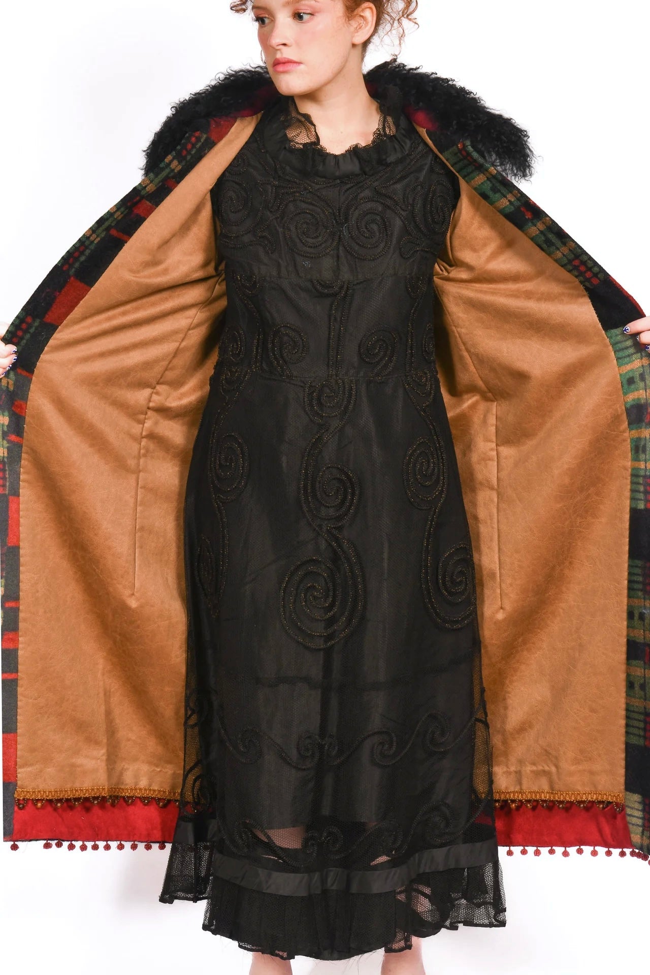 Inside, the coat reveals a lavish faux leather lining that exudes richness, edged with delicately scalloped wooden beads for a handcrafted touch. The lower inner lining, fashioned from sumptuous red suede, is meticulously hand-stitched in a couture fashion, showcasing the artisanal skill that defines this coat. A gold crimp ribbon accentuates the inner edges, further enhancing the luxurious feel.