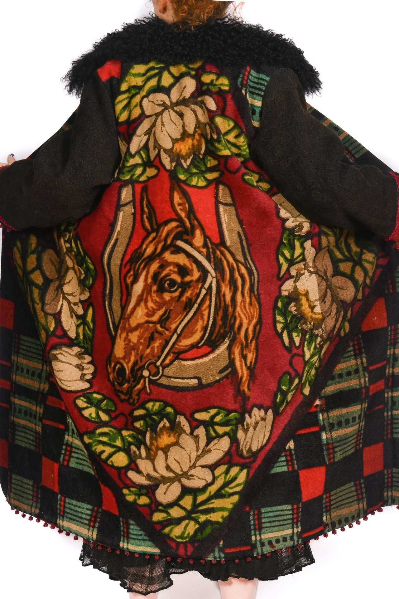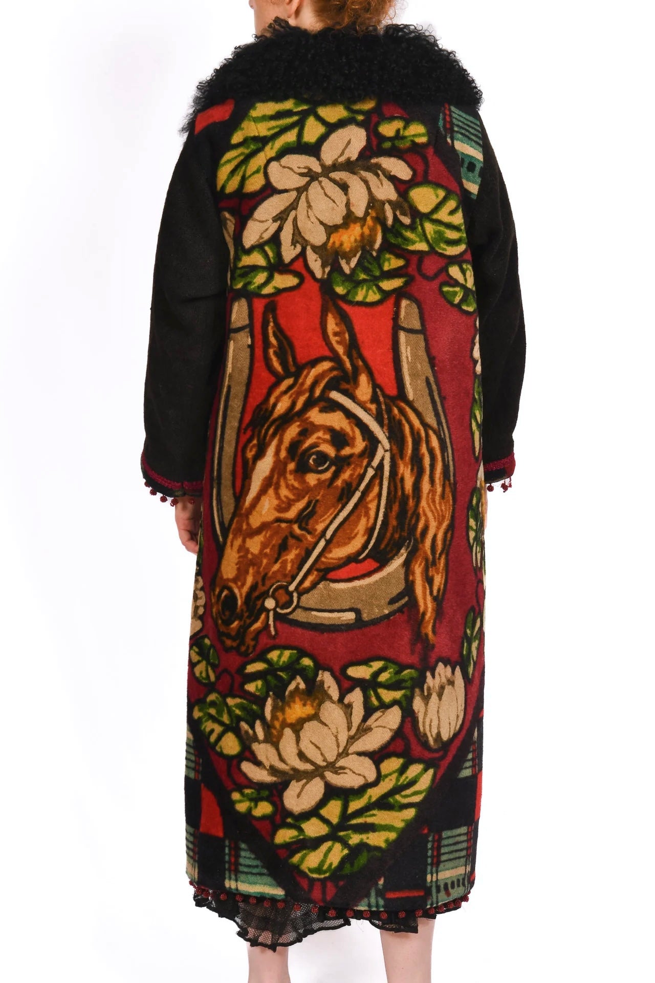 Step into a realm of timeless luxury with this one-of-a-kind bespoke coat, meticulously crafted from an antique buggy or sleigh lap blanket by the esteemed Chase Company, renowned for its exquisite textile artistry in New York from 1890 to 1920. This remarkable piece captures the essence of equestrian beauty, showcasing a stunning print of horseshoes that gracefully encircle a magnificent, bridled stallion, whose flowing mane suggests both grace and power. The deep plum backdrop serves as a striking canvas for the intricate leafy magnolia garland that frames the scene, accentuated by vibrant greens, creams, and teals, creating a harmonious blend of color and texture.
