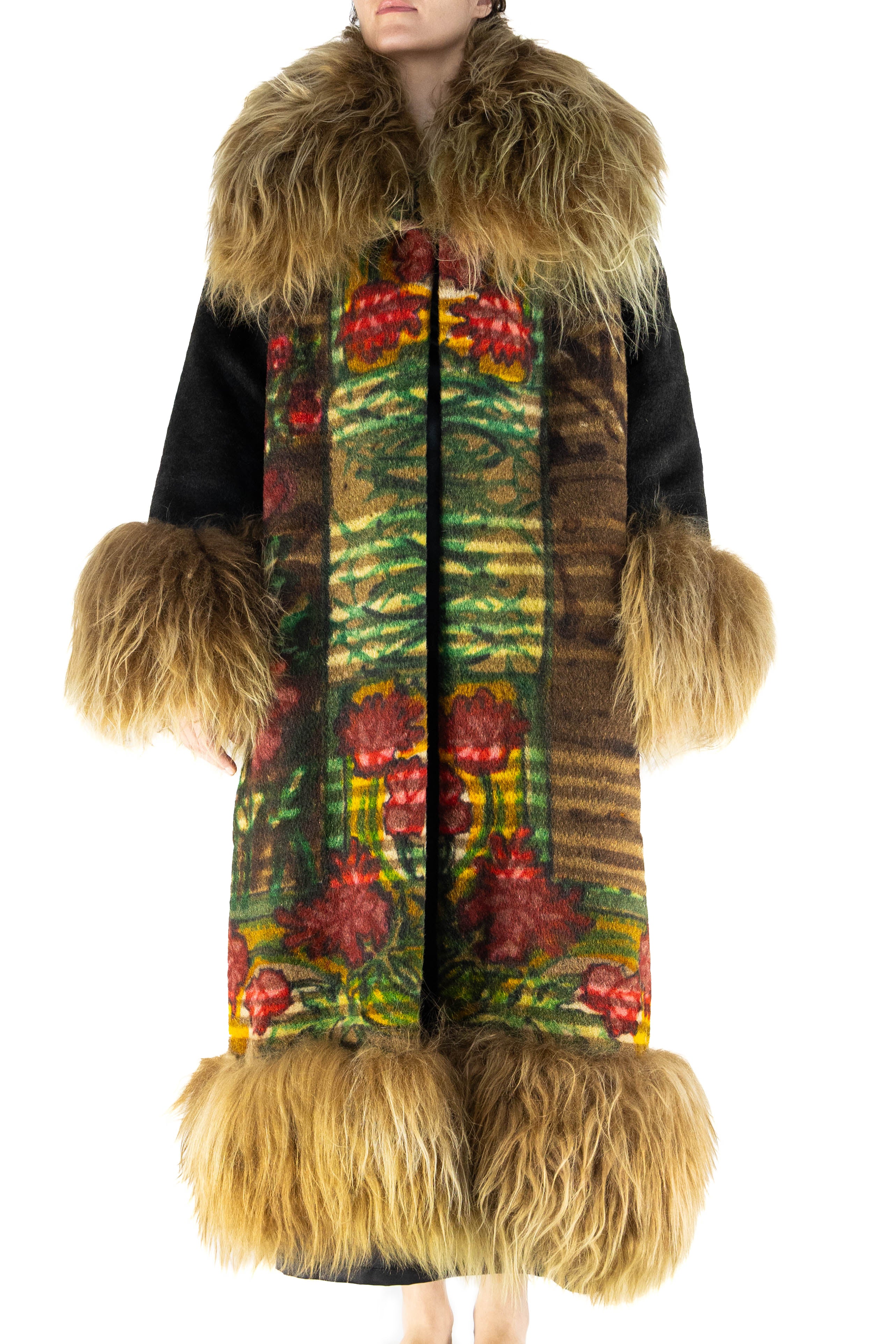 The sleeves, cut from the solid black sections of the original blanket, lend strength and balance to the design. Natural tan Icelandic lambswool trims the collar, cuffs, and hemline, offering not only warmth but also a luxurious textural contrast that frames the coat’s artistry.