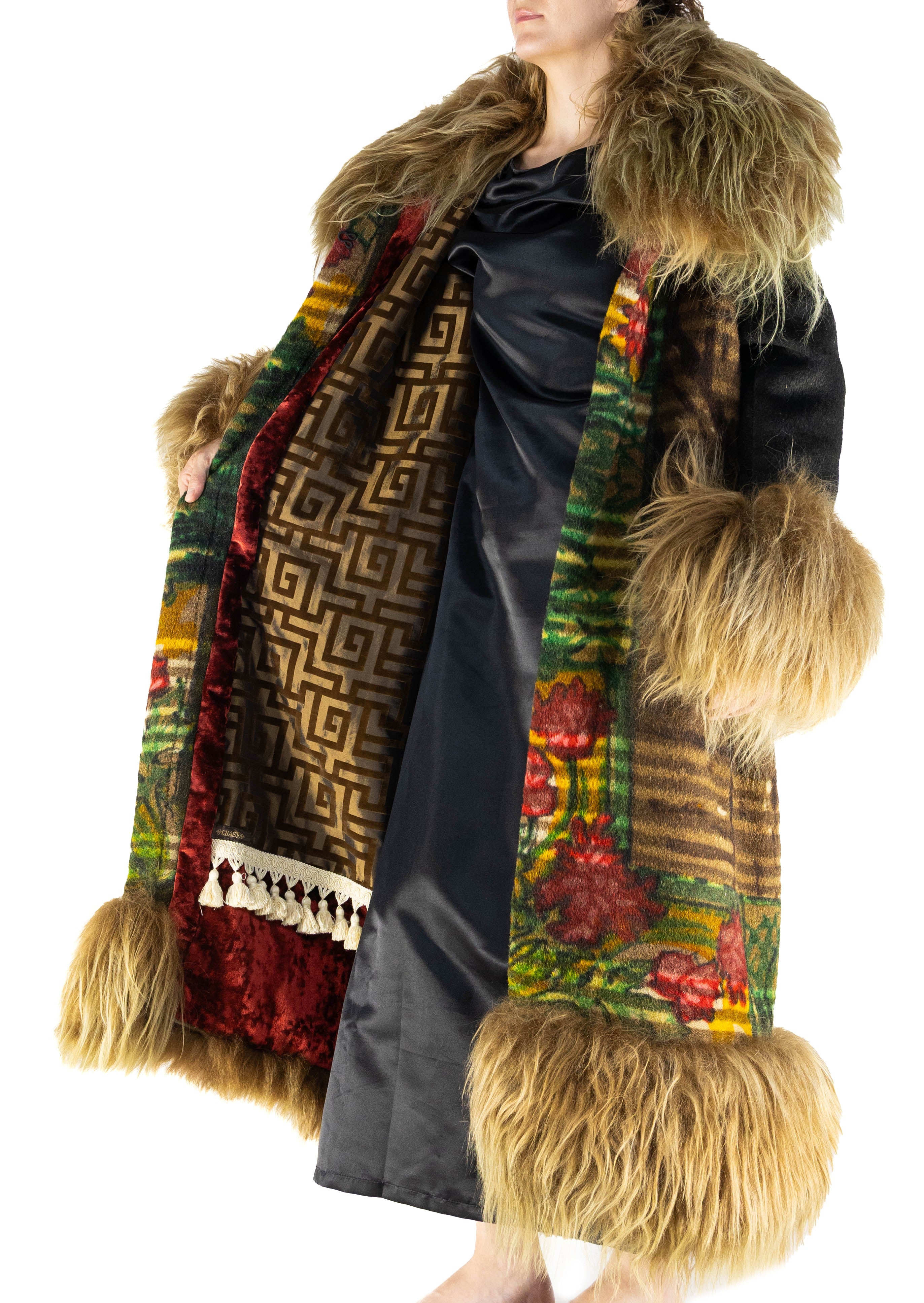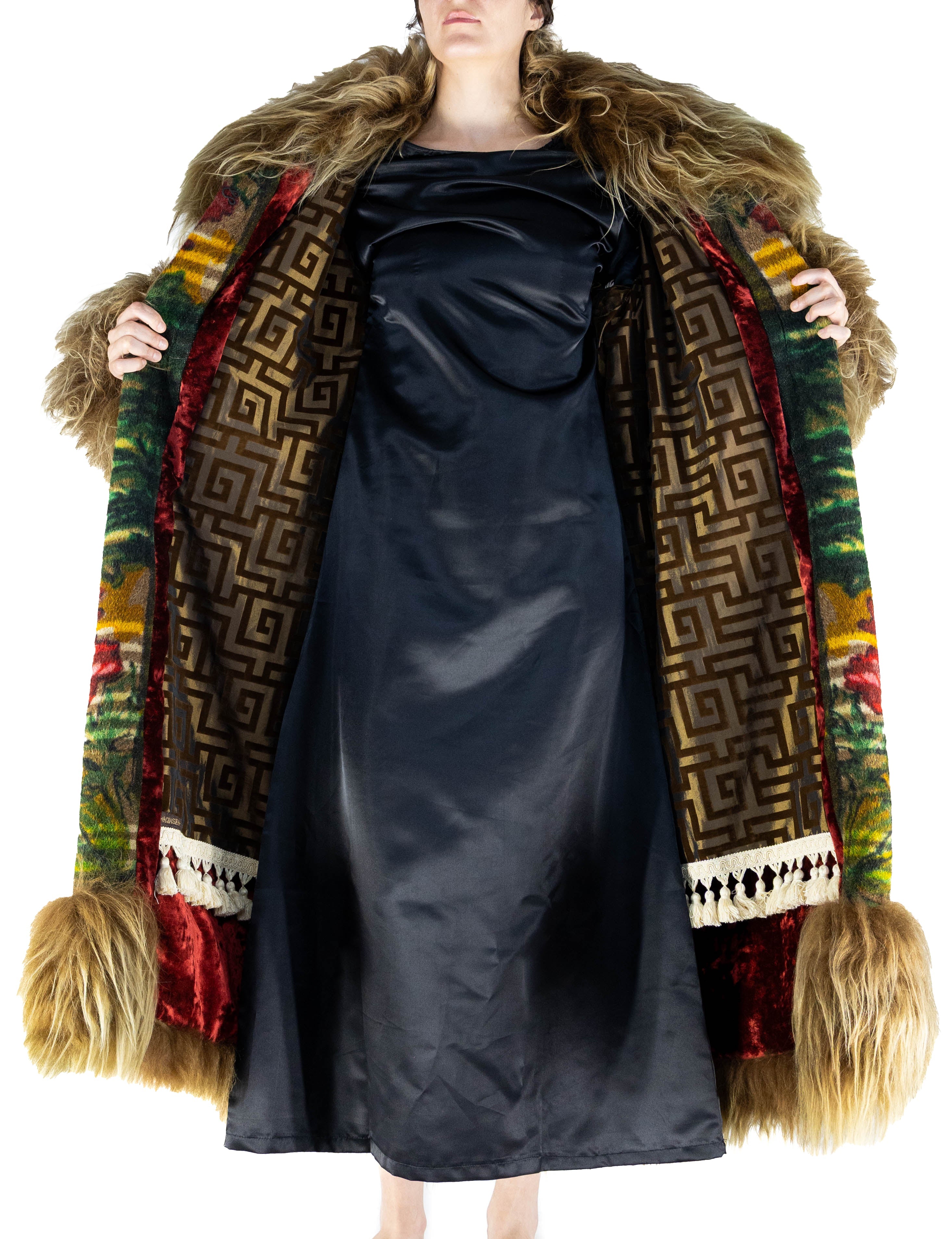 Inside, the garment is fully lined with a burnout silk and velvet Greek key fabric, a symbol of strength and timeless design. The lining is finished with a delicate cream tassel trim, echoing the elegance and refinement of the Victorian era.