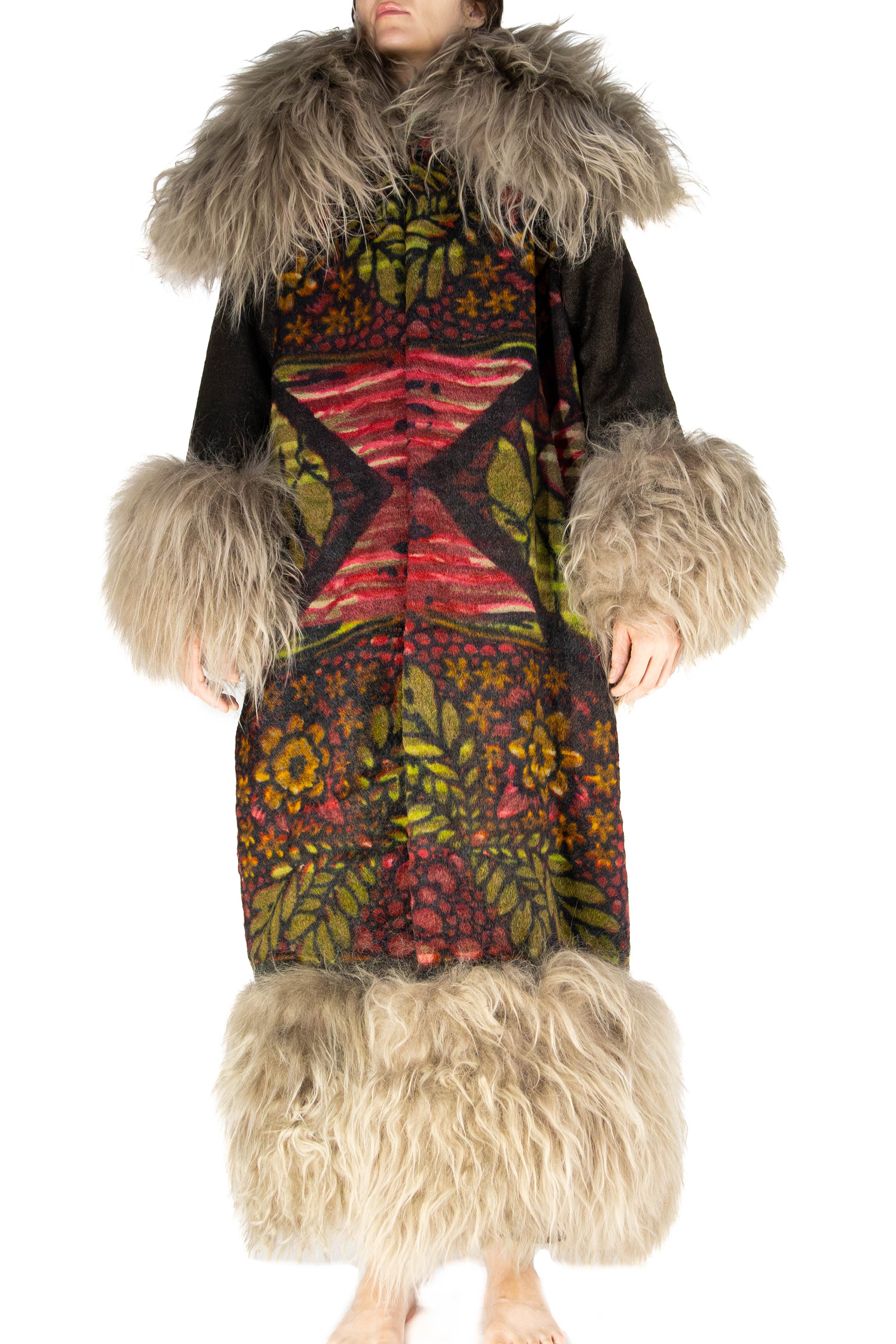 The large double collar, cuffs, and hemline are trimmed in long Winter Silver Icelandic lambswool, adding sculptural movement and luxurious texture. Two silk-lined pockets blend function with refinement.