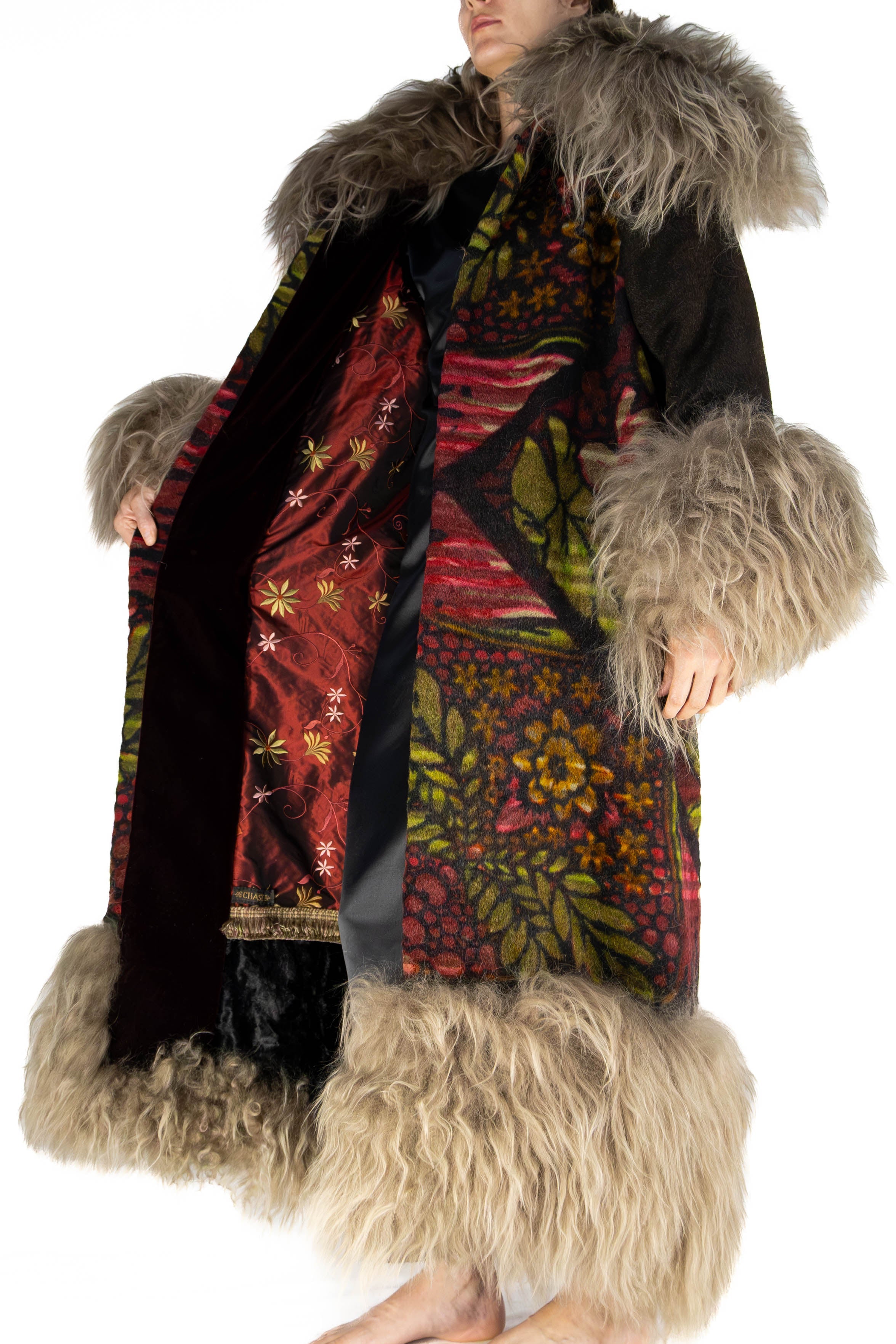 Inside, burgundy velvet circles the collar and traces both front panels, while the base of the coat is grounded in rich black velvet. The interior lining is crafted from burgundy silk embroidered with florals, finished with a woven tassel trim. The original Chase carriage blanket tag remains stitched to the lining—a rare historical detail preserved with intention.
