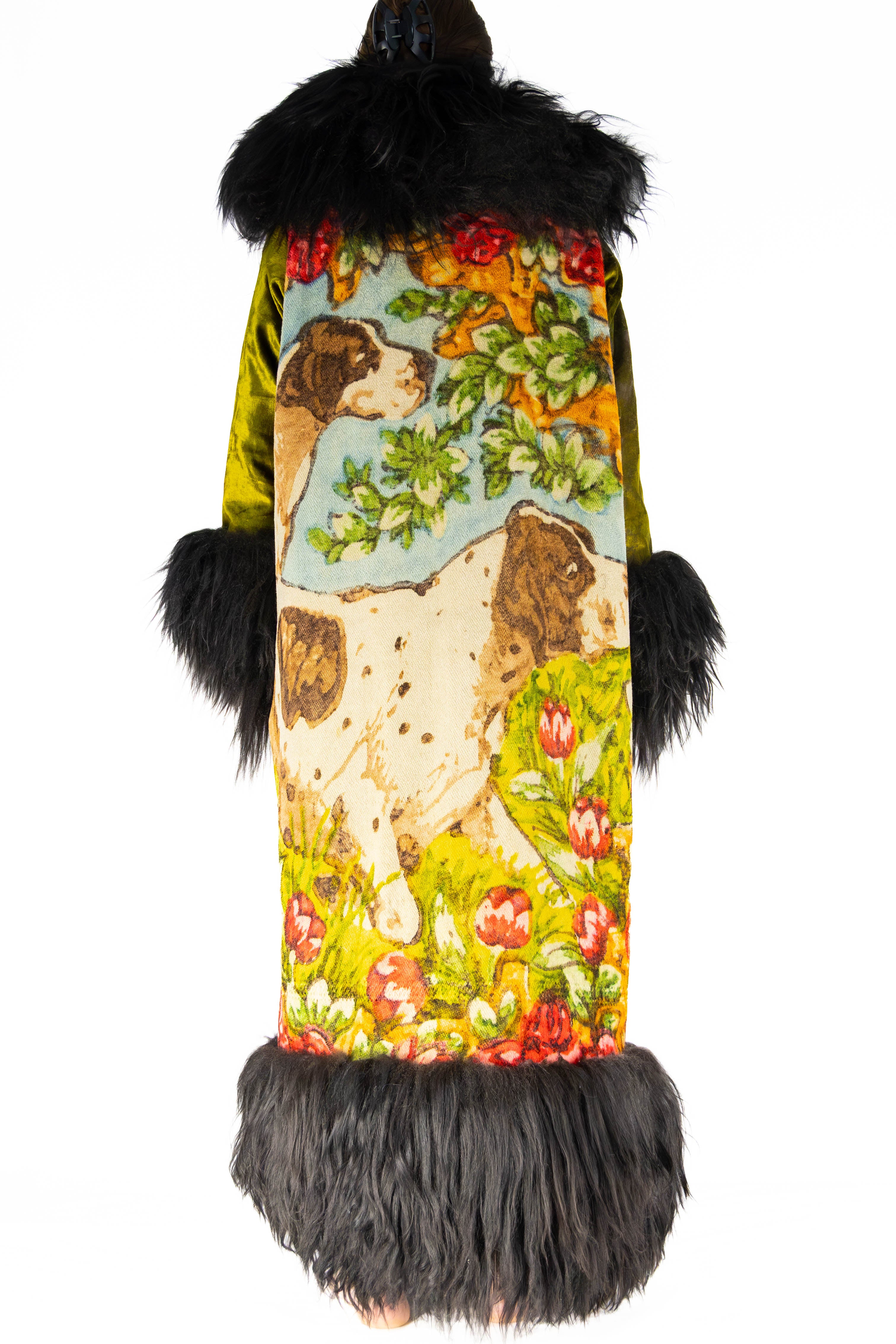 The back of the coat features a beautifully preserved scene of two English Pointer dogs, poised and alert, standing in a field of roses rendered in crimson velvet-red and blushed petal pinks, all nestled within verdant botanical greenery. This pastoral motif wraps seamlessly to the front of the coat, which includes two silk-lined pockets for comfort and function.