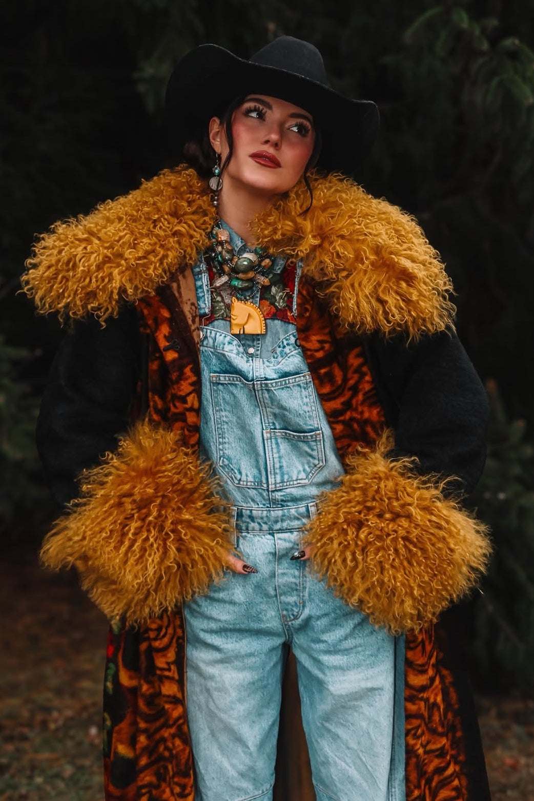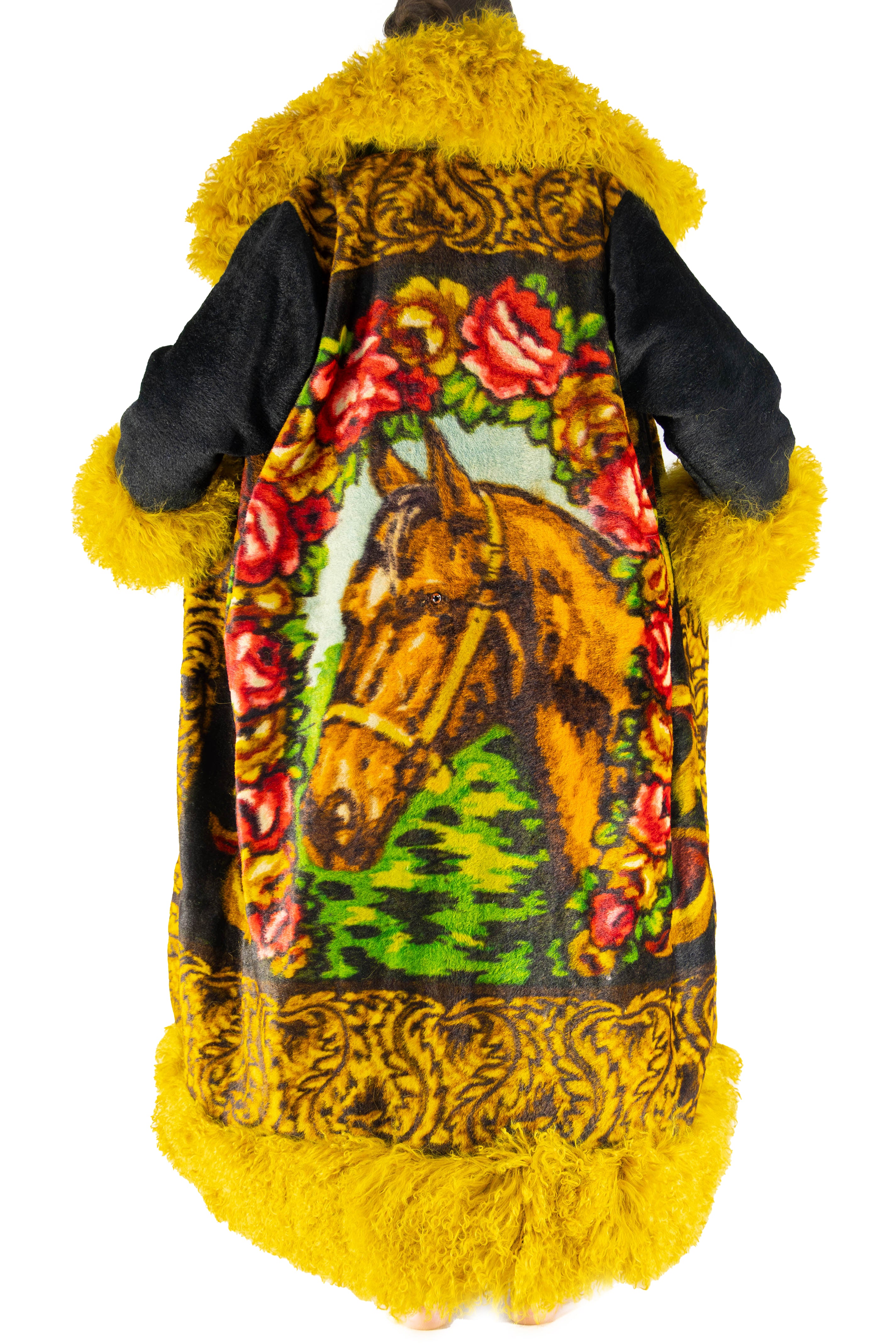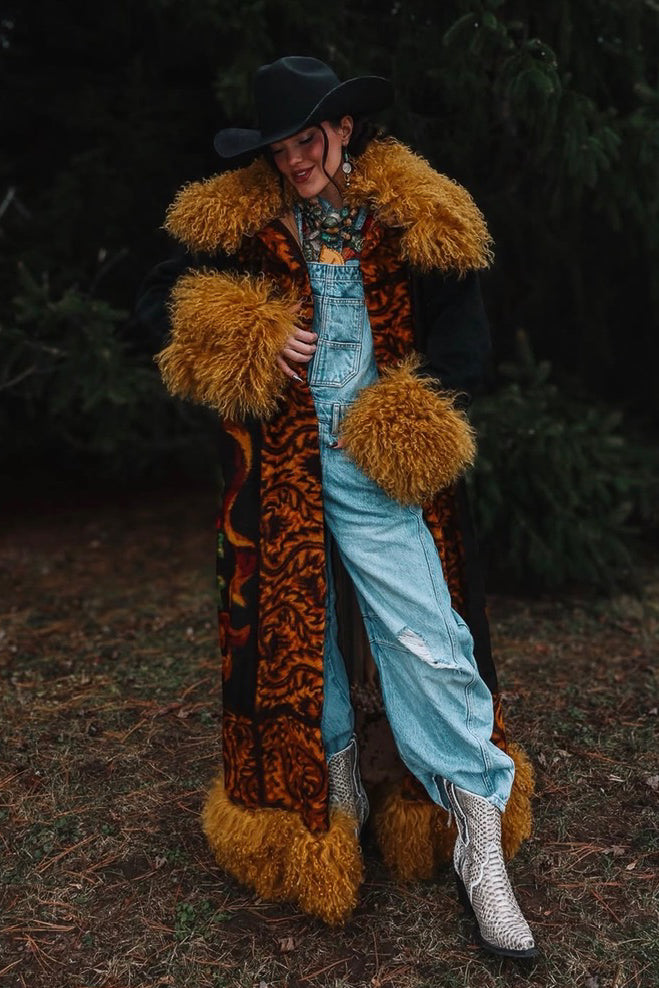 The collar, cuffs, and hemline are enveloped in golden Mongolian lambswool, adding warmth, texture, and a regal glow. The underside of the collar continues the original blanket design, offering a subtle glimpse of the textile’s heritage when turned up.