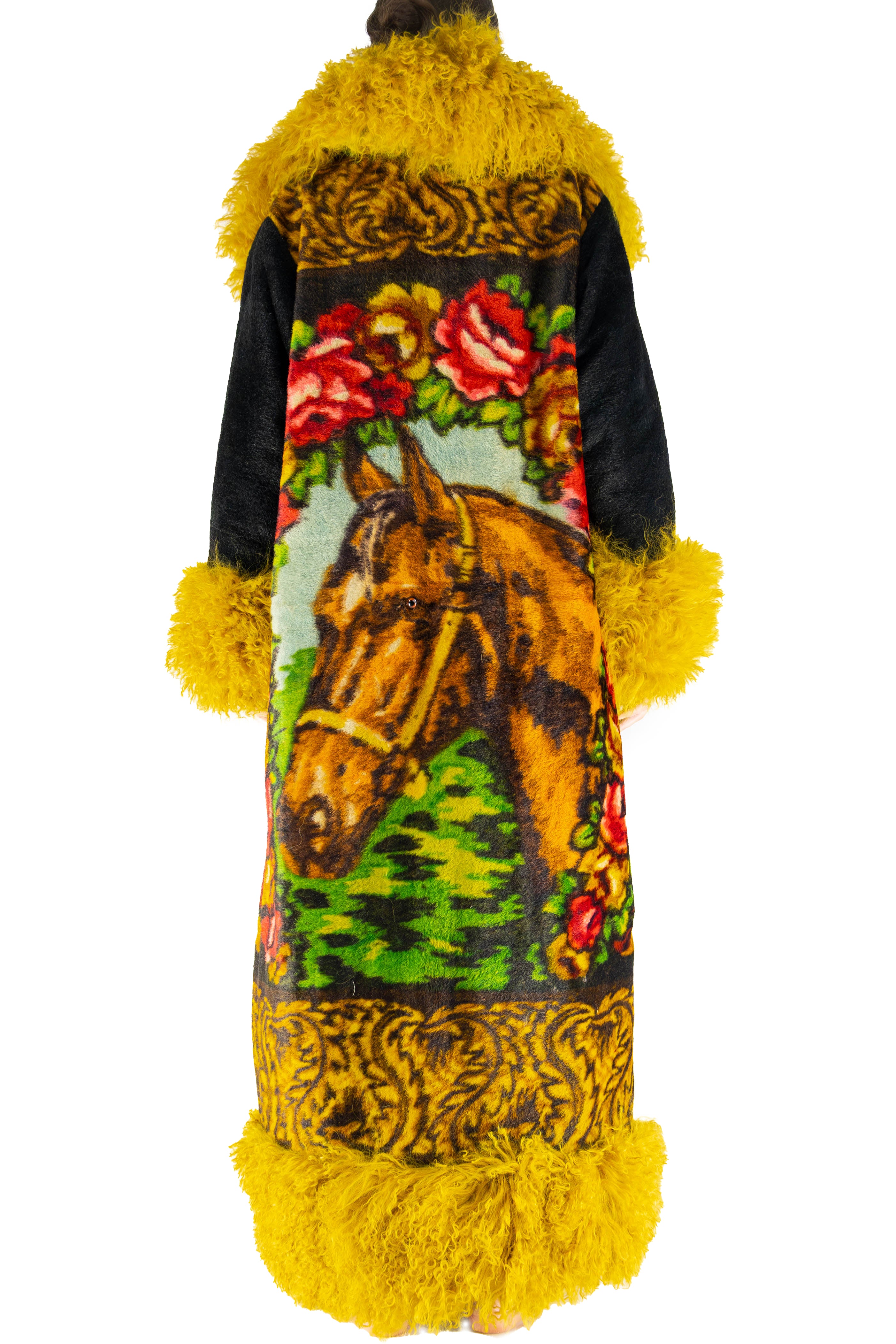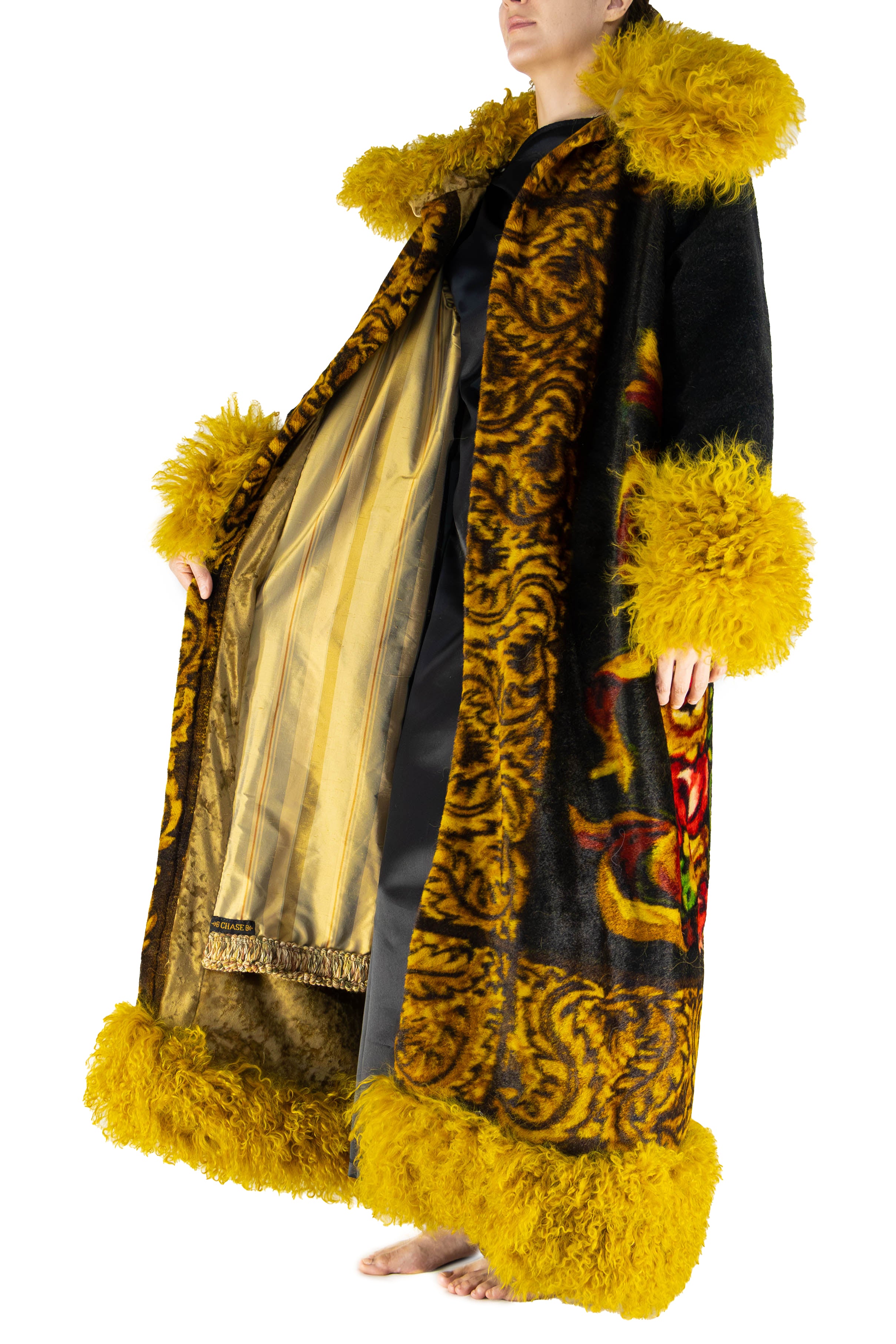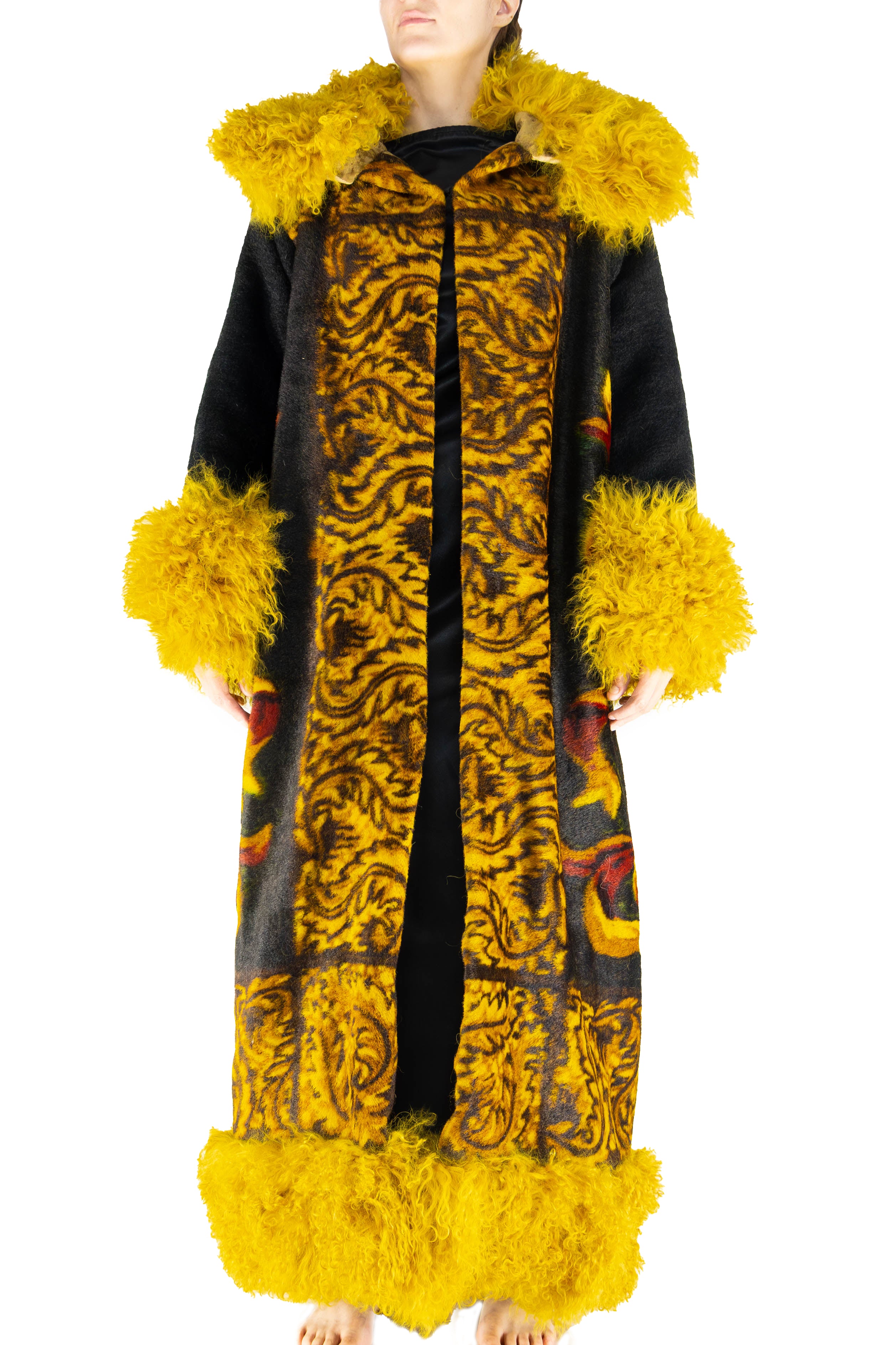 The collar, cuffs, and hemline are enveloped in golden Mongolian lambswool, adding warmth, texture, and a regal glow. The underside of the collar continues the original blanket design, offering a subtle glimpse of the textile’s heritage when turned up.