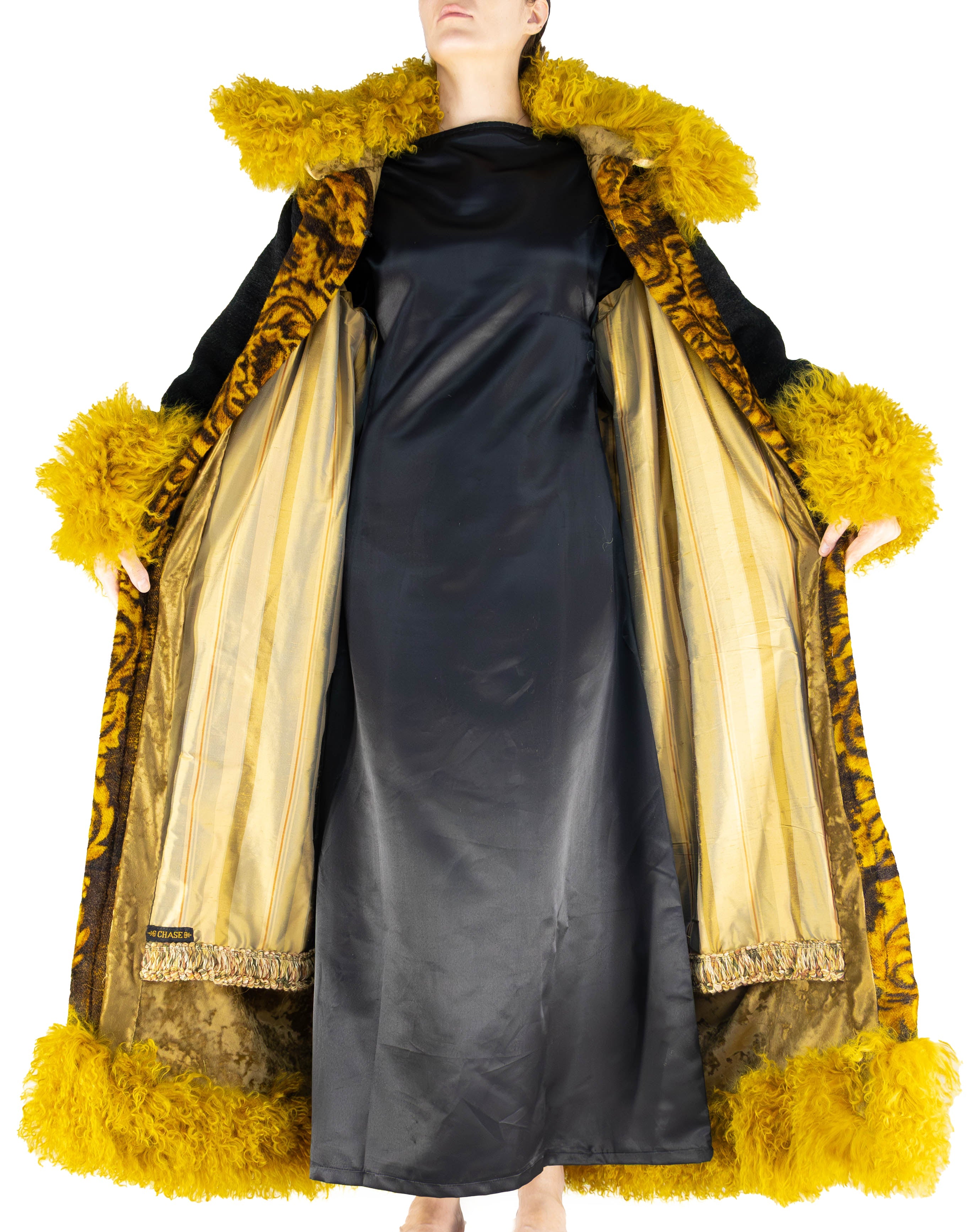 Inside, the coat is lined in striped silk that shimmers in tones of antique gold, silvery blue, burnished bronze, and copper, echoing the richness of the exterior palette. The inner front panels and bottom hem are wrapped in deep oyster velvet, while the base of the silk lining is finished with a brush fringe trim in soft shades of sage, blush, and cream, adding movement and delicate refinement.