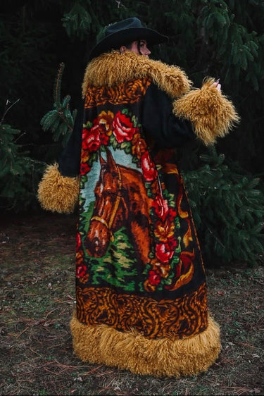 At Nomadic Reign Couture, each coat is a work of art. Our garments are not mass-produced but are individually handcrafted from rare antique buggy/sleigh blankets, and vintage tapestries—textiles that are often over a century old. Because every piece is unique, created with great time and care, they are considered final-sale items.