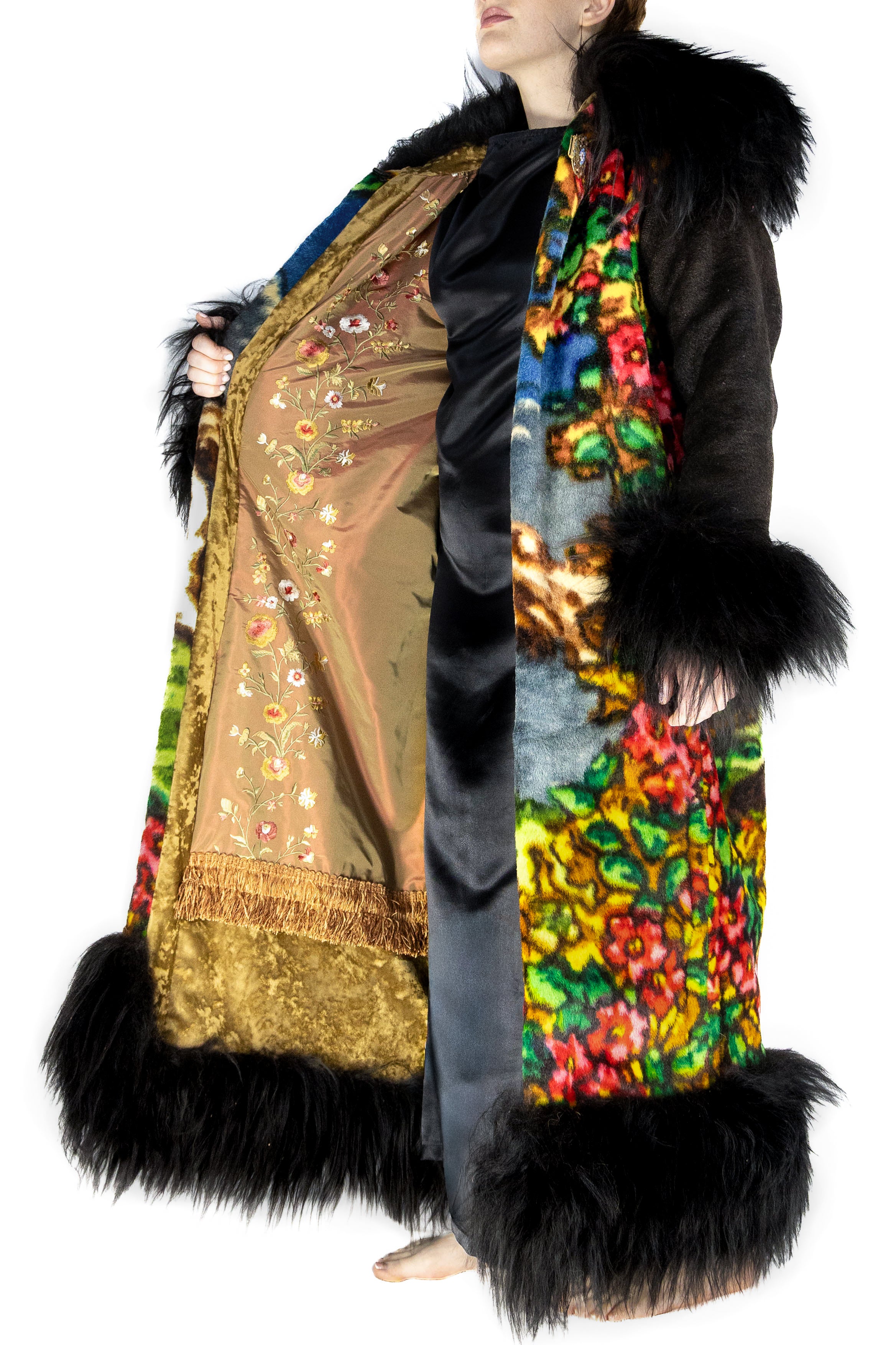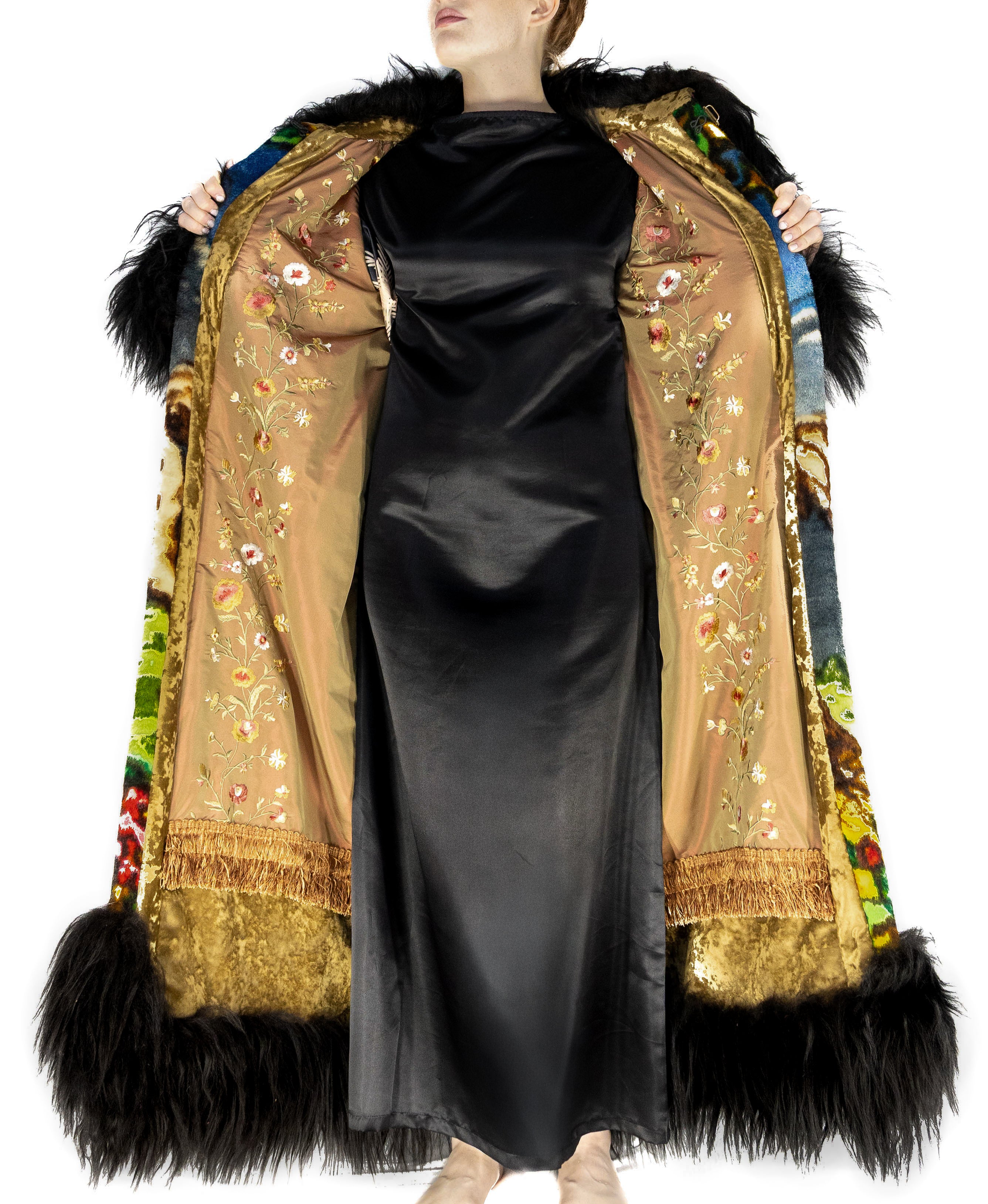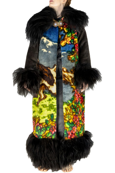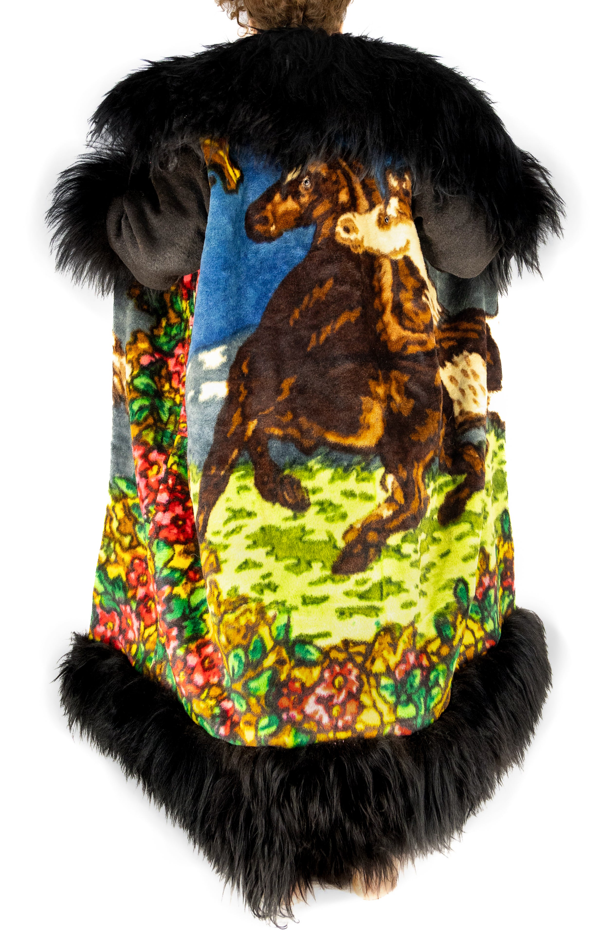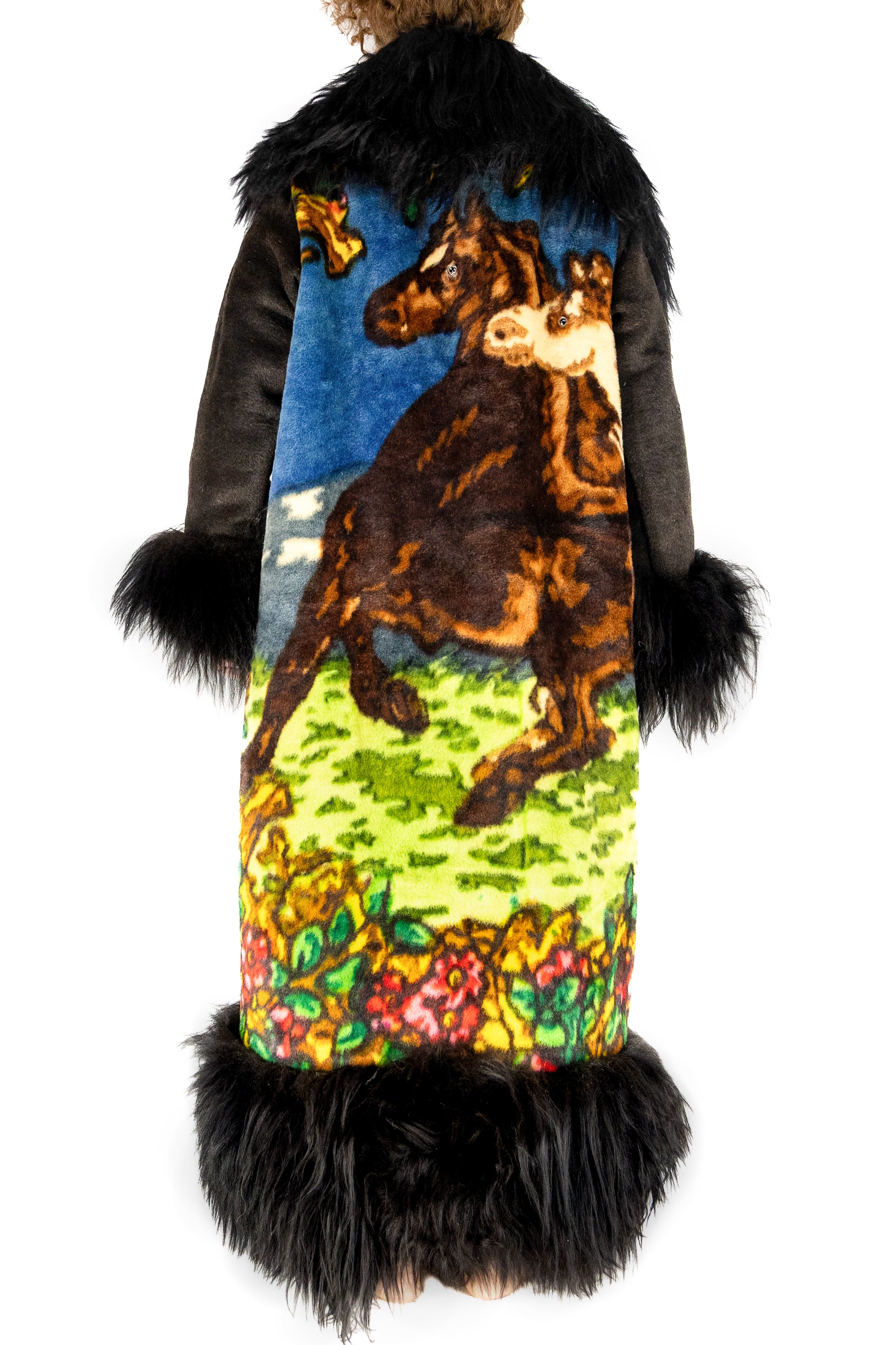 The back of this extraordinary coat showcases a dynamic motif of two horses galloping across a verdant meadow—one a rich chestnut, the other a creamy dappled bay. Above them stretches a luminous cerulean sky, with distant mountains in deep slate and misty periwinkle tones, creating a breathtaking natural panorama. Framing this scene is a lavish border of florals and foliage in fuchsia, emerald, and burnished gold, a design that elegantly continues across the front panels.