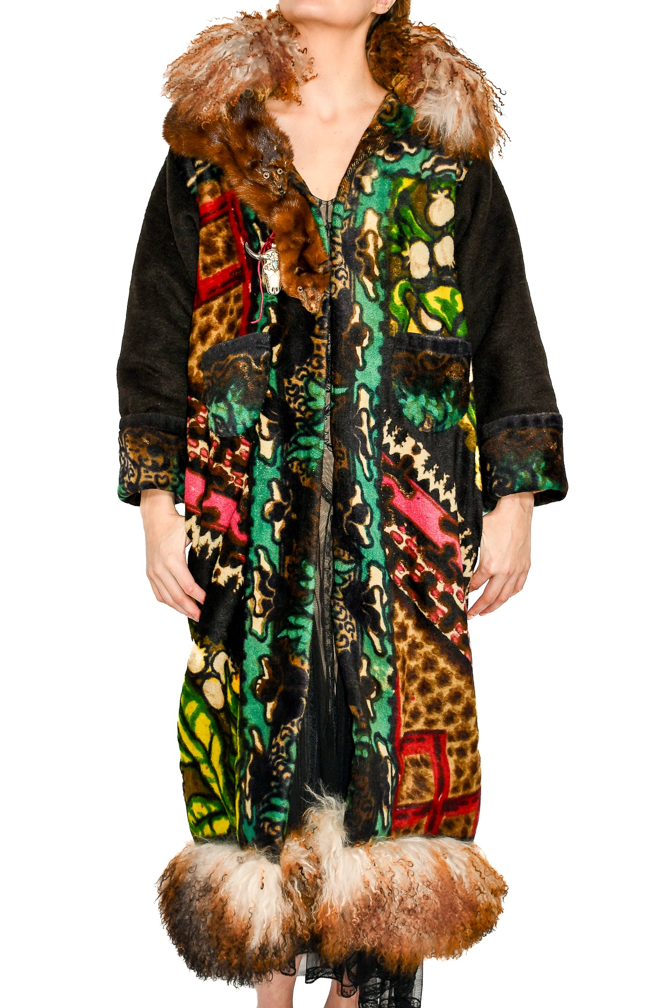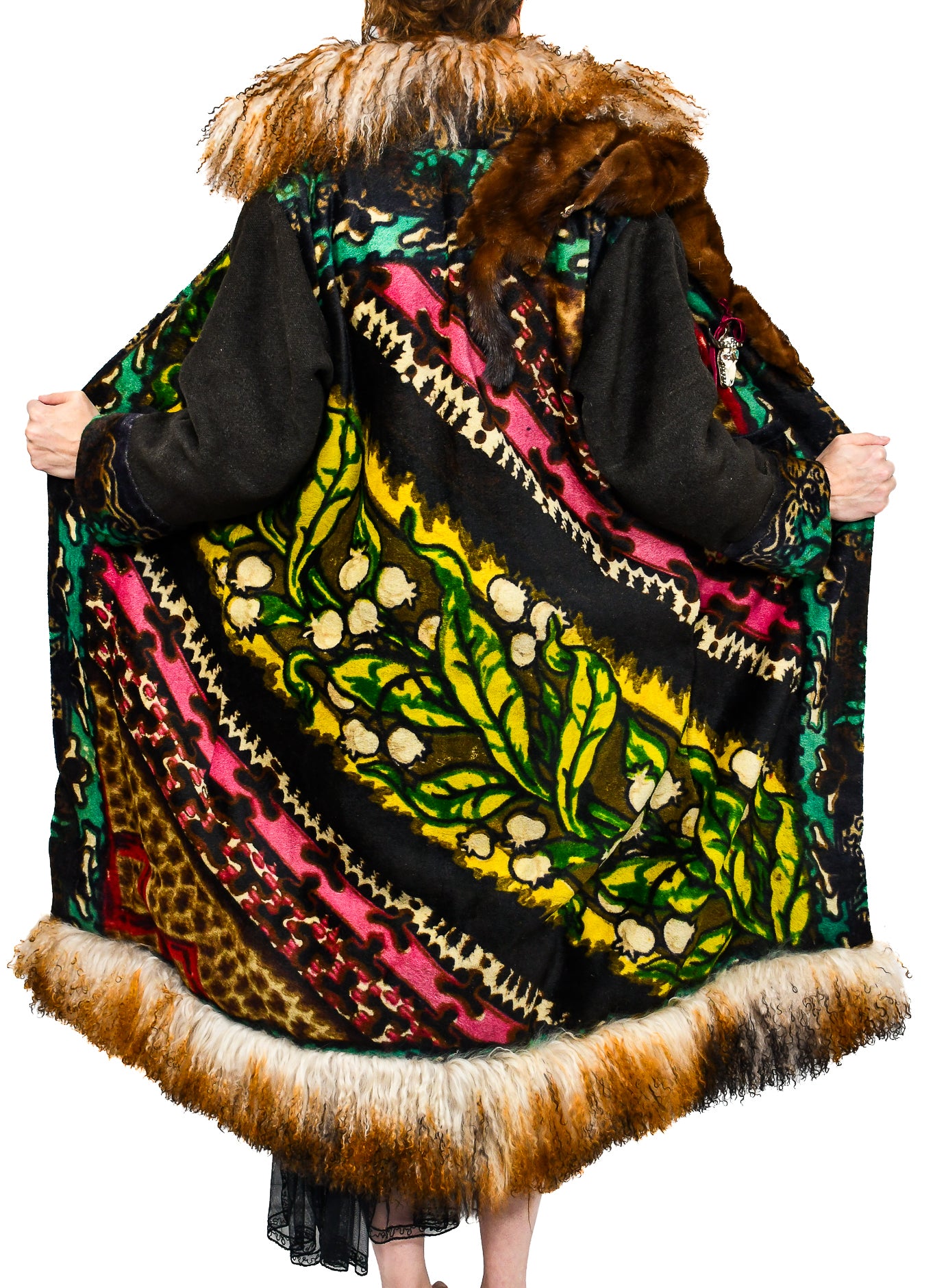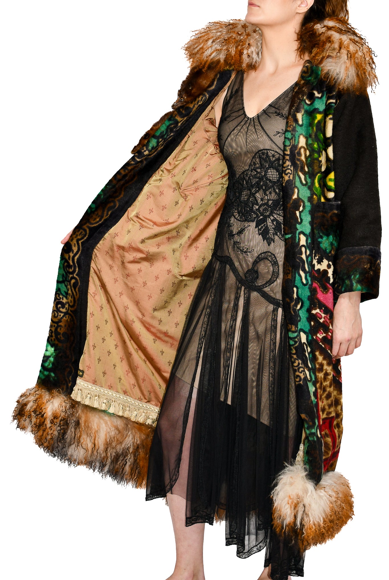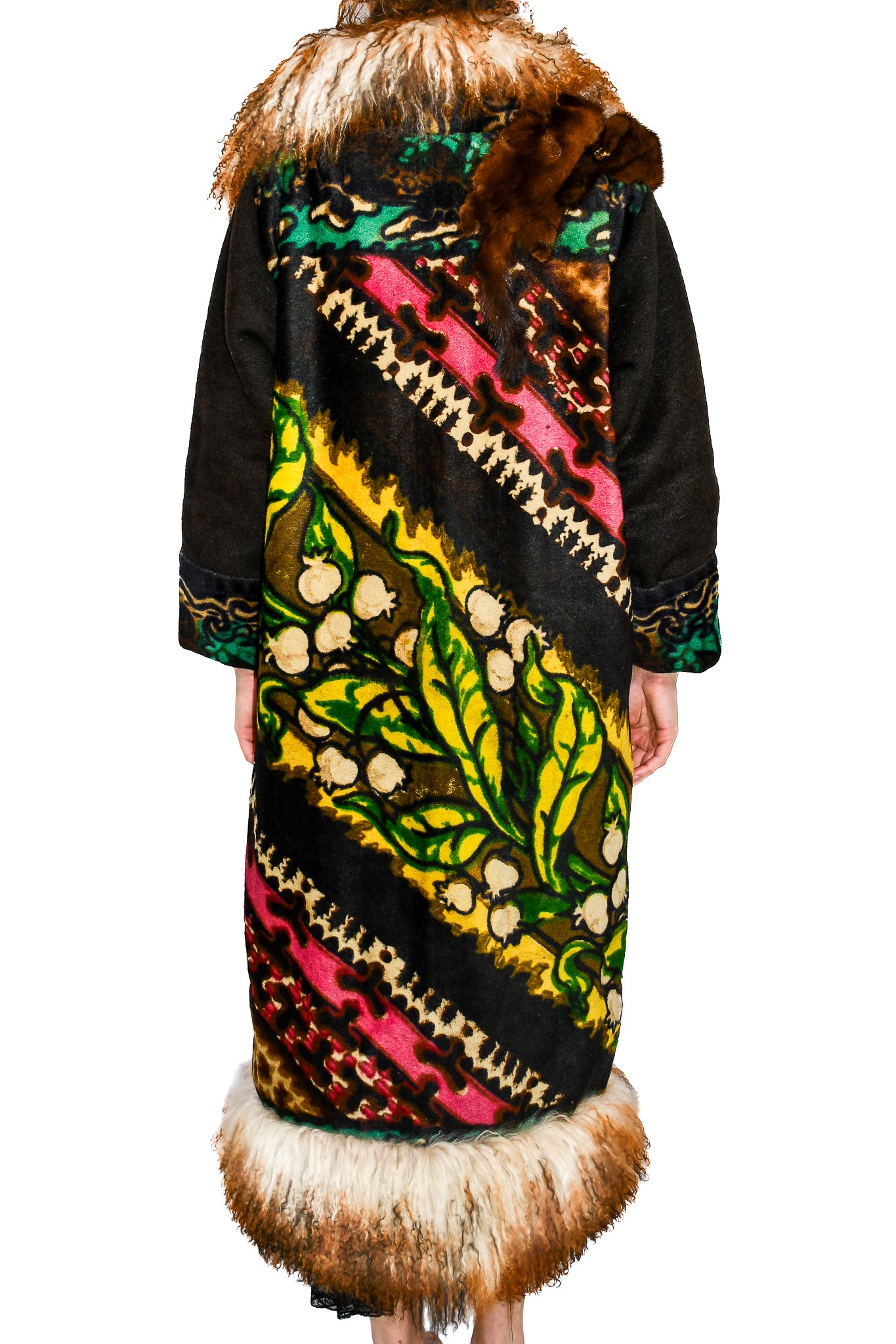 The coat features a vivid floral botanical motif, showcasing delicate white lily of the valley blossoms nestled within ornate borders. Earthy tones of mossy green, golden yellow, warm brown, deep burgundy, and black bring a grounded richness to the design. The collar and bottom hem are trimmed in ombre Mongolian lamb’s wool, blending shades of eggshell white, copper, and deep chocolate brown, adding a luxe, natural texture.