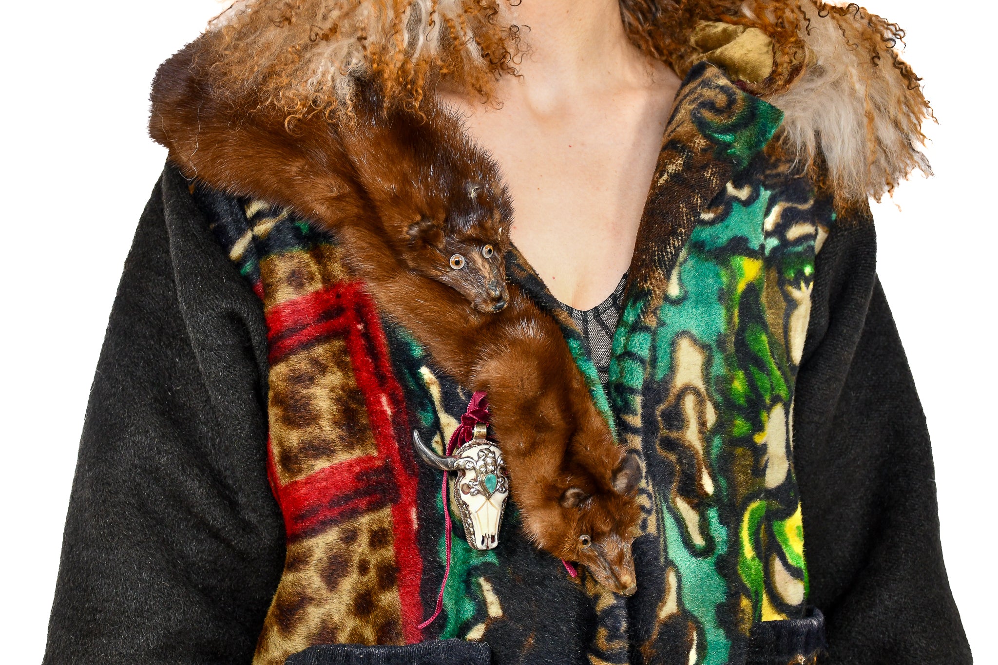 A distinctive detail of this piece is the addition of two American mink pelts, draped over the right shoulder for dramatic flair. From one of the minks hangs a carved bone longhorn skull pendant, inlaid with turquoise and finished with a decorative silver overlay, adding a Southwestern spirit to the coat’s old-world elegance.