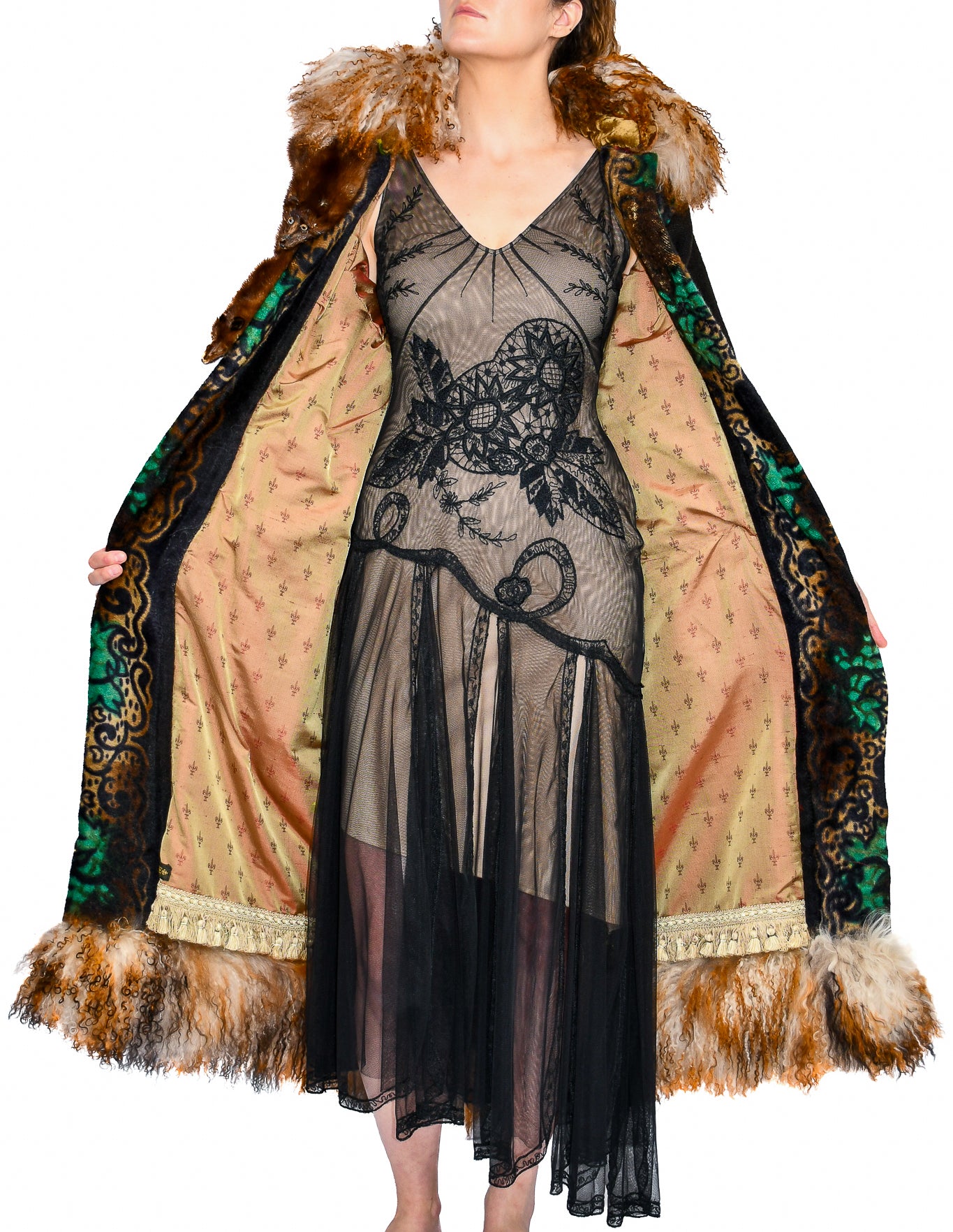 The front panels, a continuation of the back’s floral design, each feature a small contrasting pocket for added interest. Inside, the coat is lined with jacquard-woven silk in a regal fleur-de-lis pattern, in wine red and gold tones. A cream-colored woven tassel trim lines the interior hem, and the bottom liner is a plush green velvet with a subtle lattice motif.
