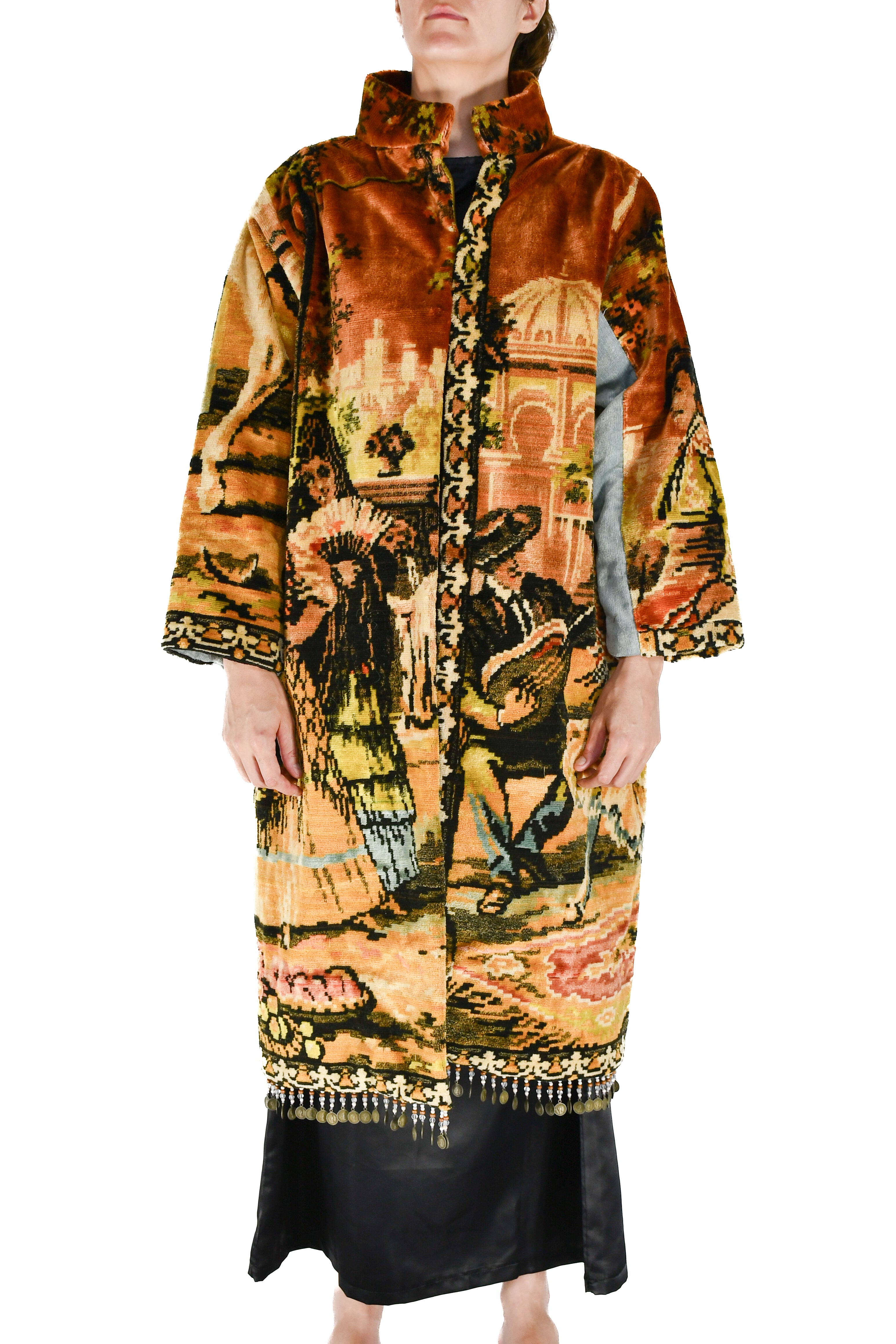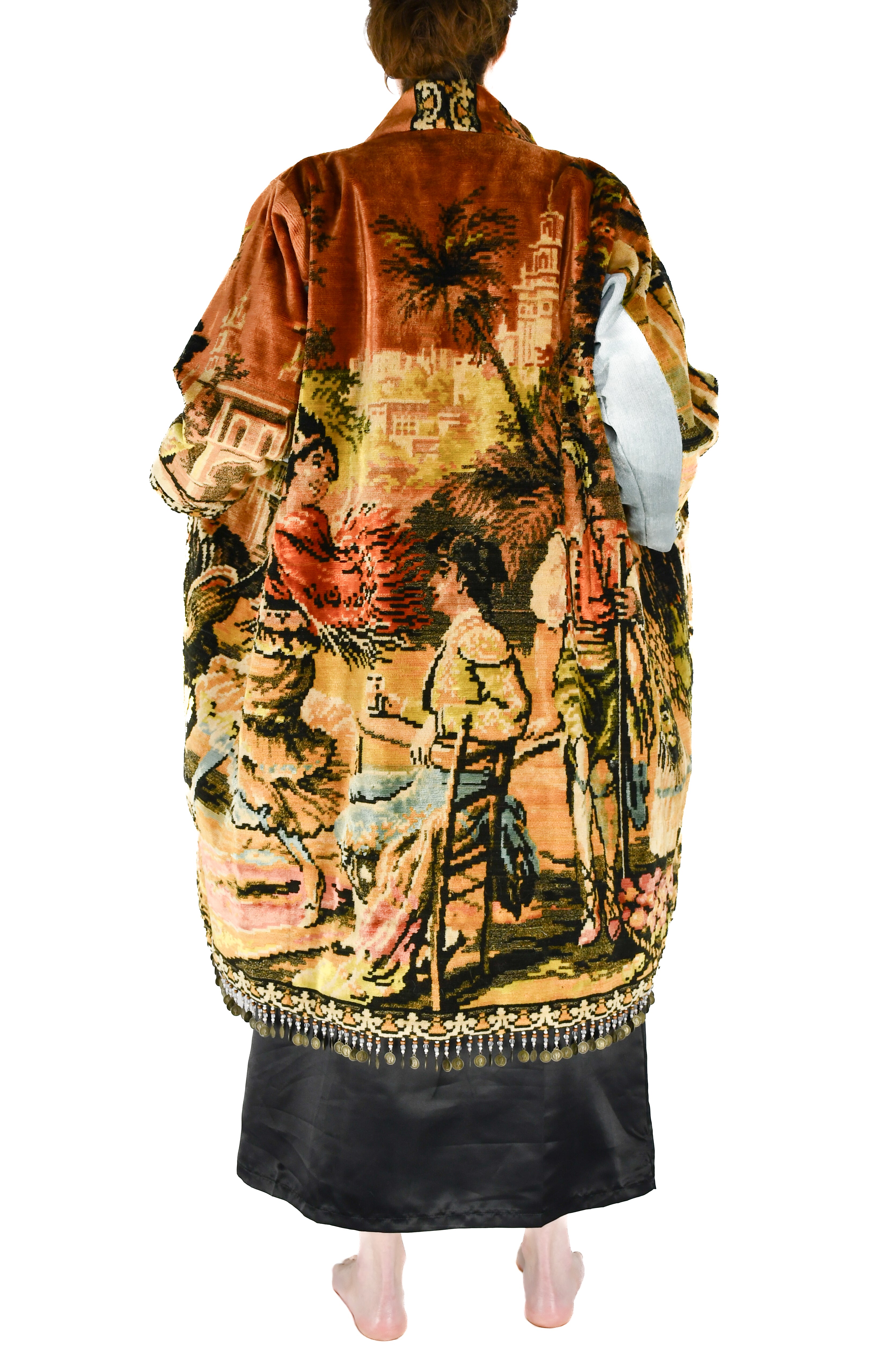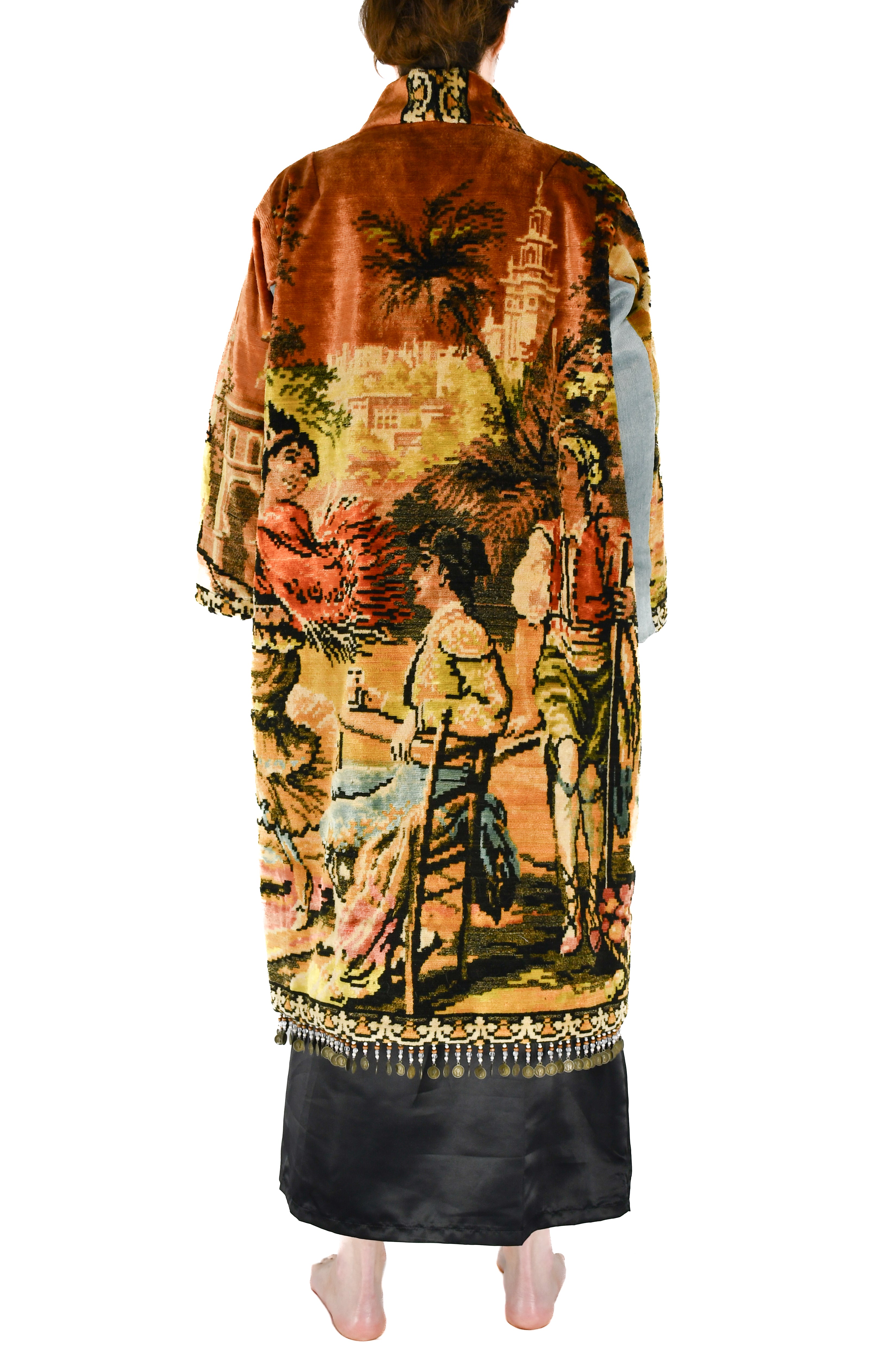 The sleeves continue the tapestry’s composition seamlessly, allowing the full tableau to wrap organically around the garment. For contrast and surprise, the undersides of the sleeves are lined in sky blue velvet, adding a flash of soft brilliance with each movement. The coat fastens with a discreet hook-and-eye closure, maintaining the visual integrity of the artwork.
