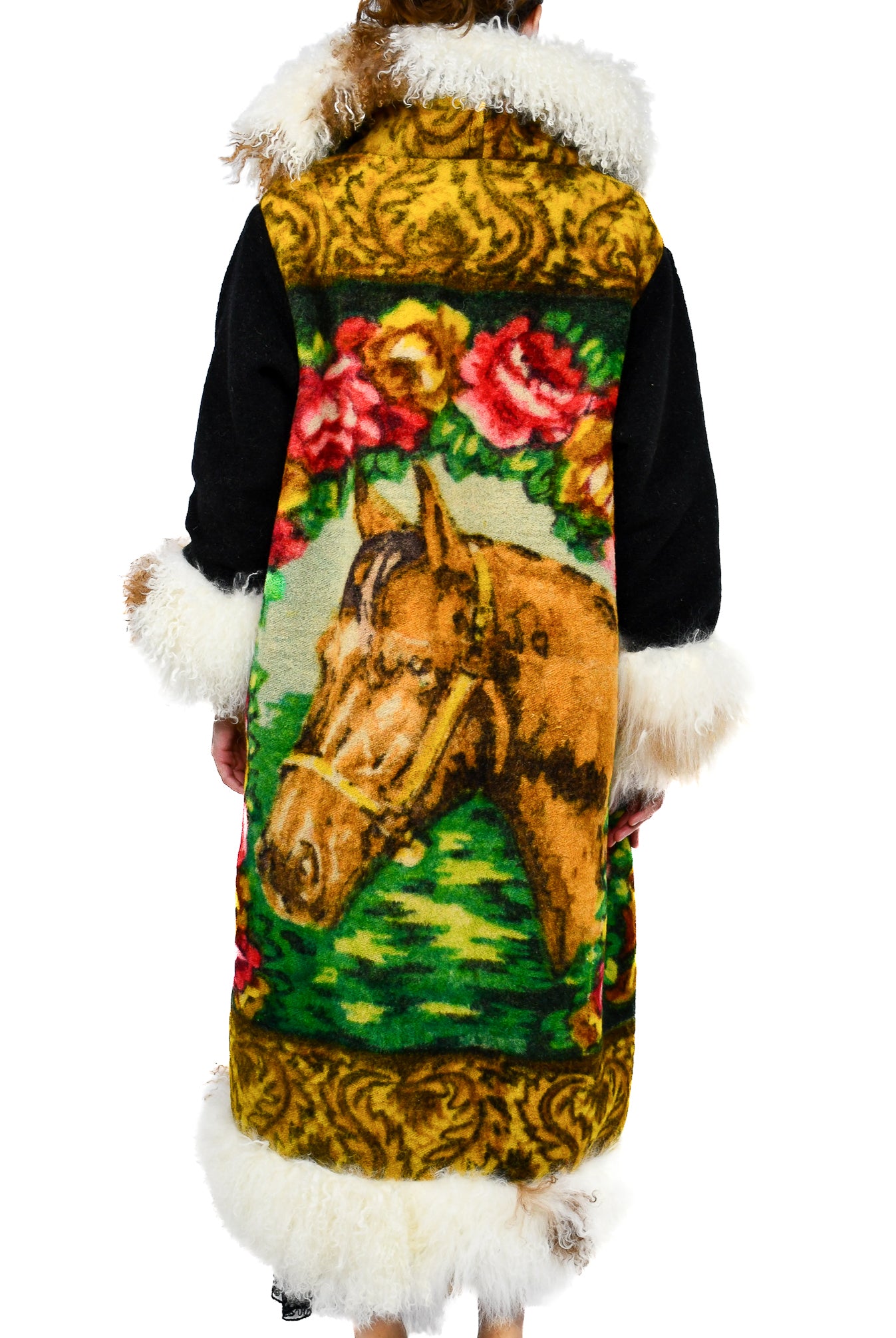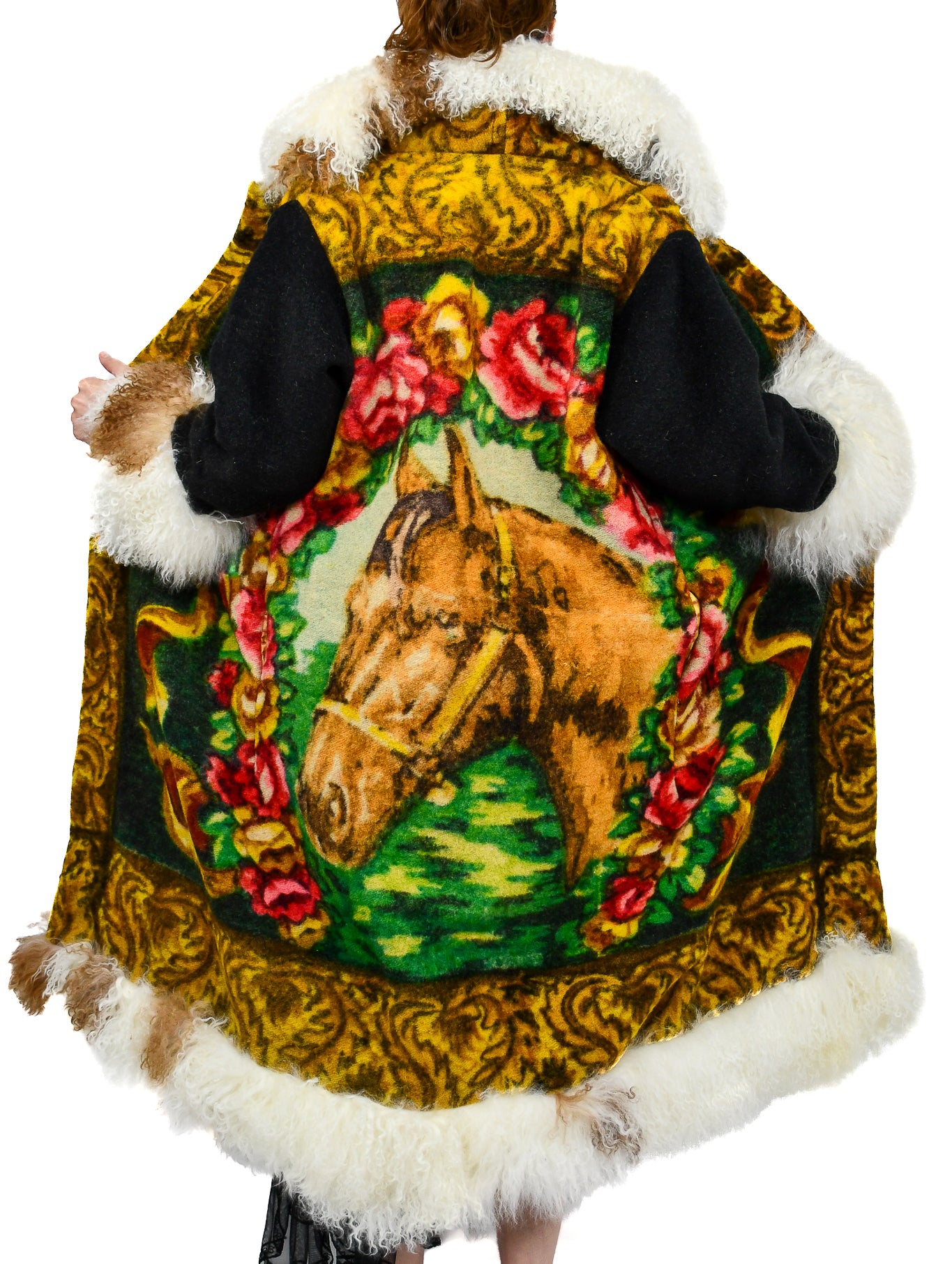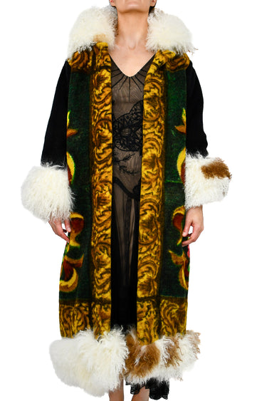 The sleeves, cut from the original black base of the blanket, retain the integrity of the textile’s historical composition. The coat is generously trimmed in plush Mongolian lambswool—in hues of cream and caramel—along the cuffs, full skirt hem, and up through the collar, creating an opulent contrast to the dense tapestry weave of the body.