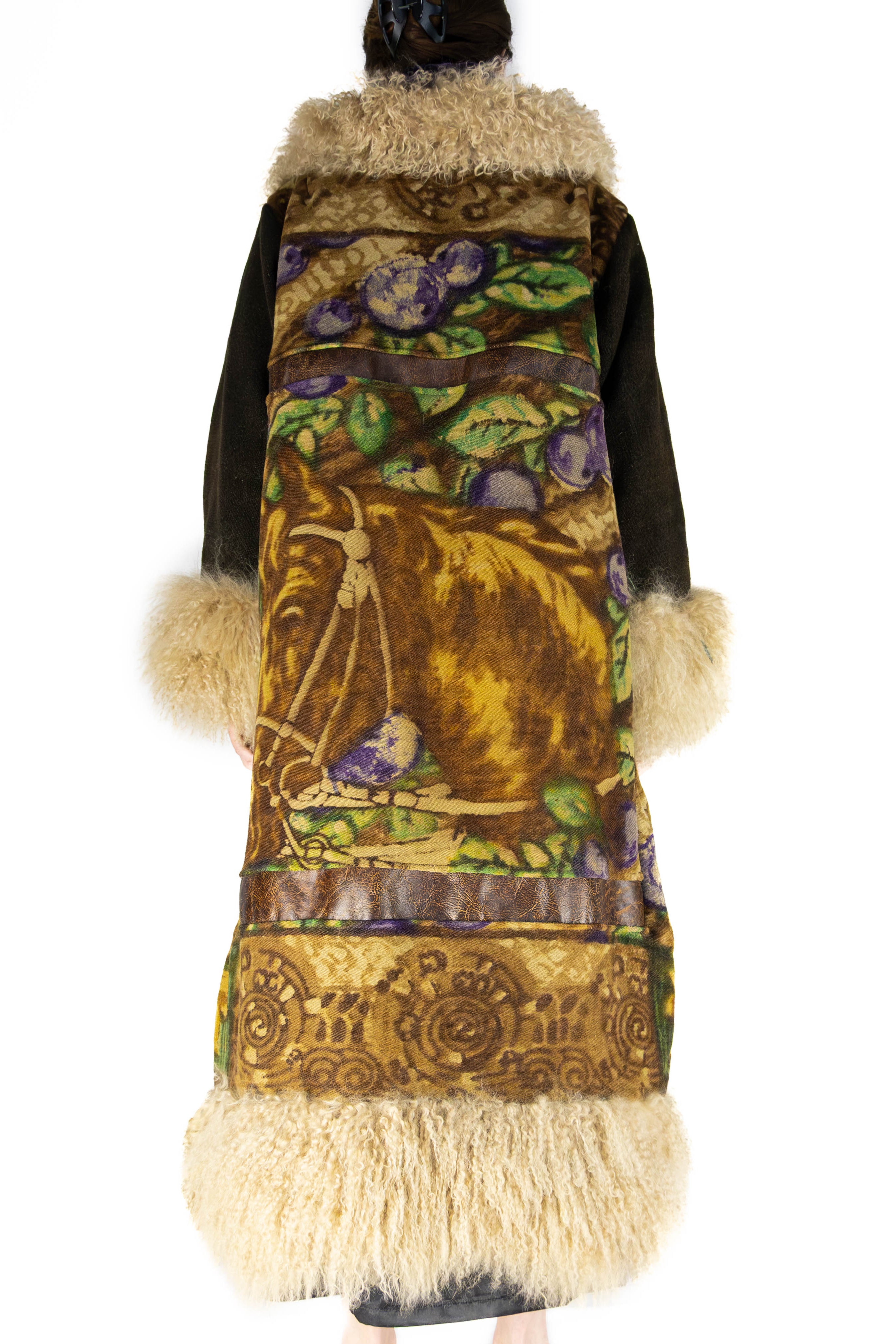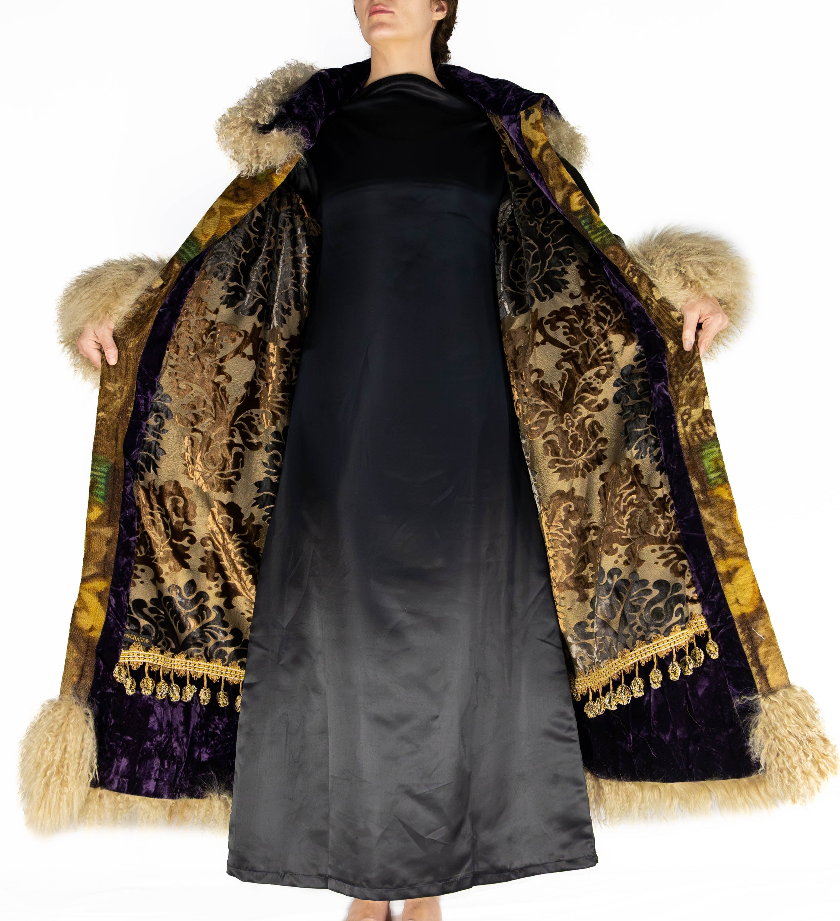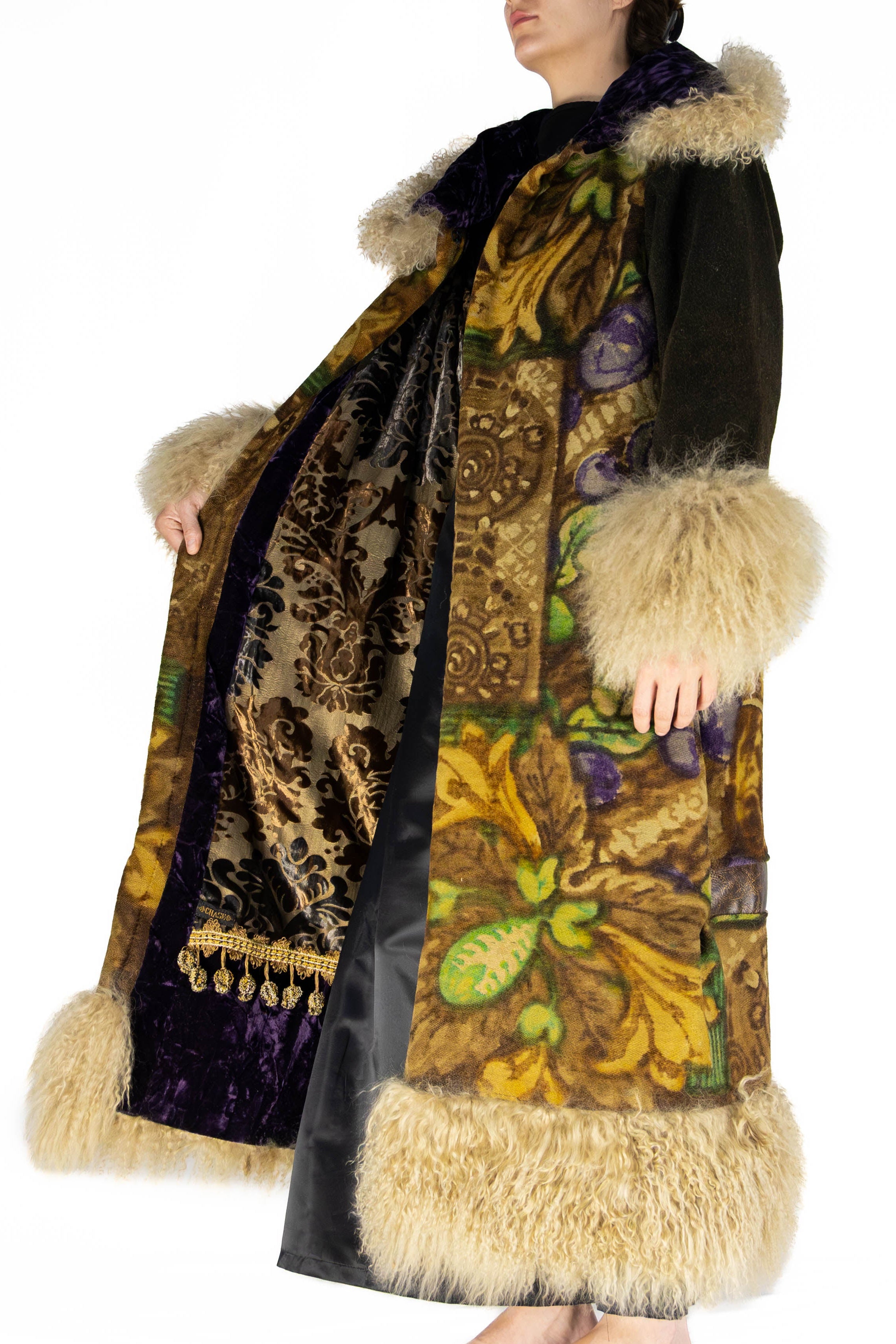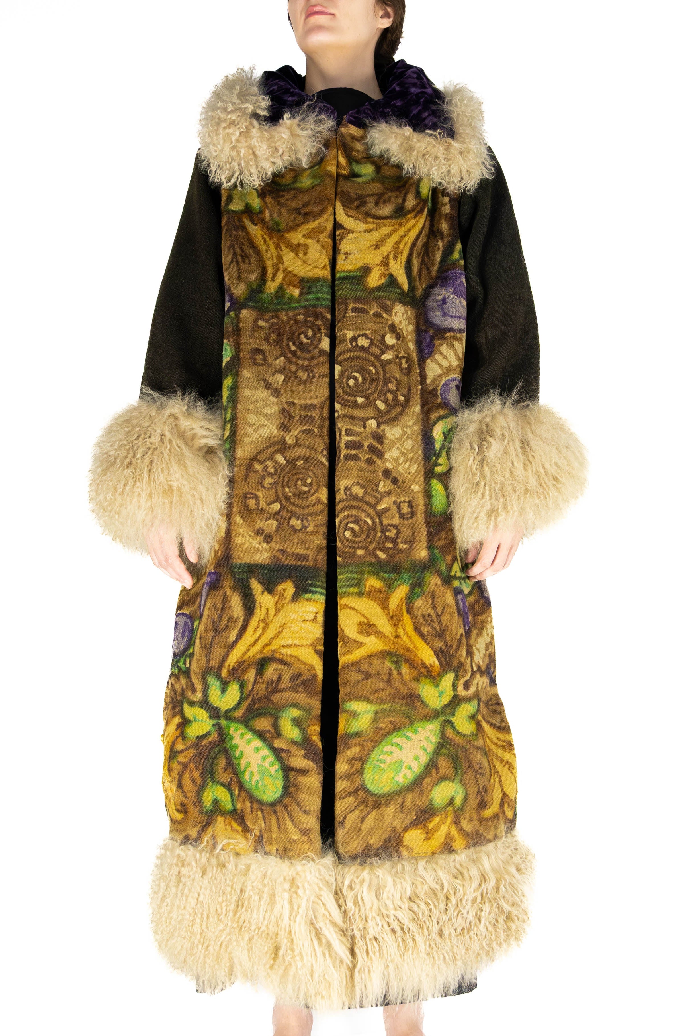 A sweeping trim of lambswool in a creamy wheat tone lines the hem, cuffs, and collar, bringing warmth and tactile beauty. The collar itself is wrapped in royal purple velvet, adding a regal depth that contrasts beautifully with the natural tones of the woven textile.