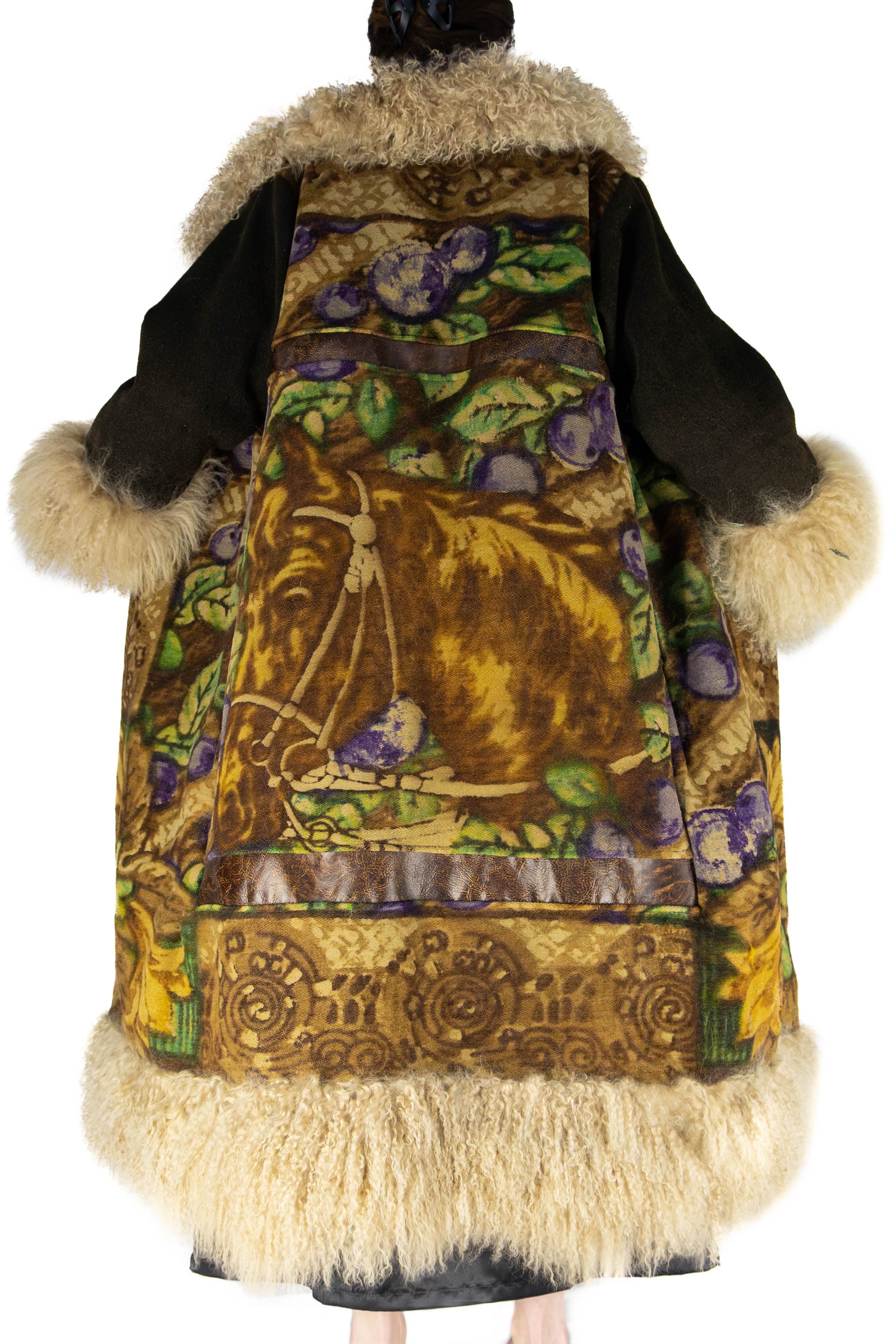 The back of the coat reveals a majestic horse, woven in rich tones of tawny chestnut, golden umber, and sepia, surrounded by lush foliage in hues of meadow green, olive leaf, and plum violet. Above and below, intricate scrollwork and geometric borders in camel and deep espresso frame the motif, celebrating the artistry of early American loom work.